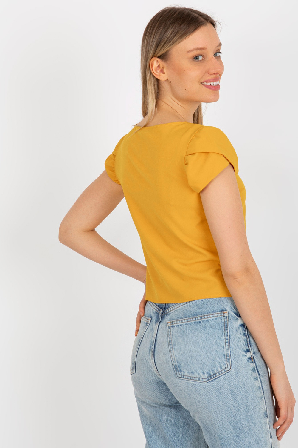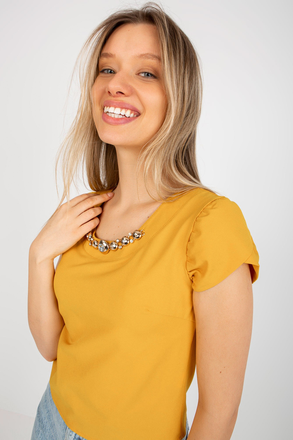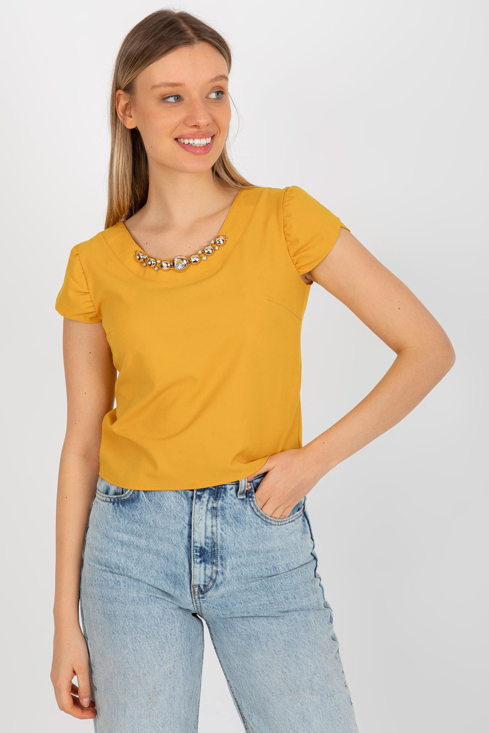 Tamsiai geltona iškilminga palaidinė su aplikacijomis ir trumpomis rankovėmis.