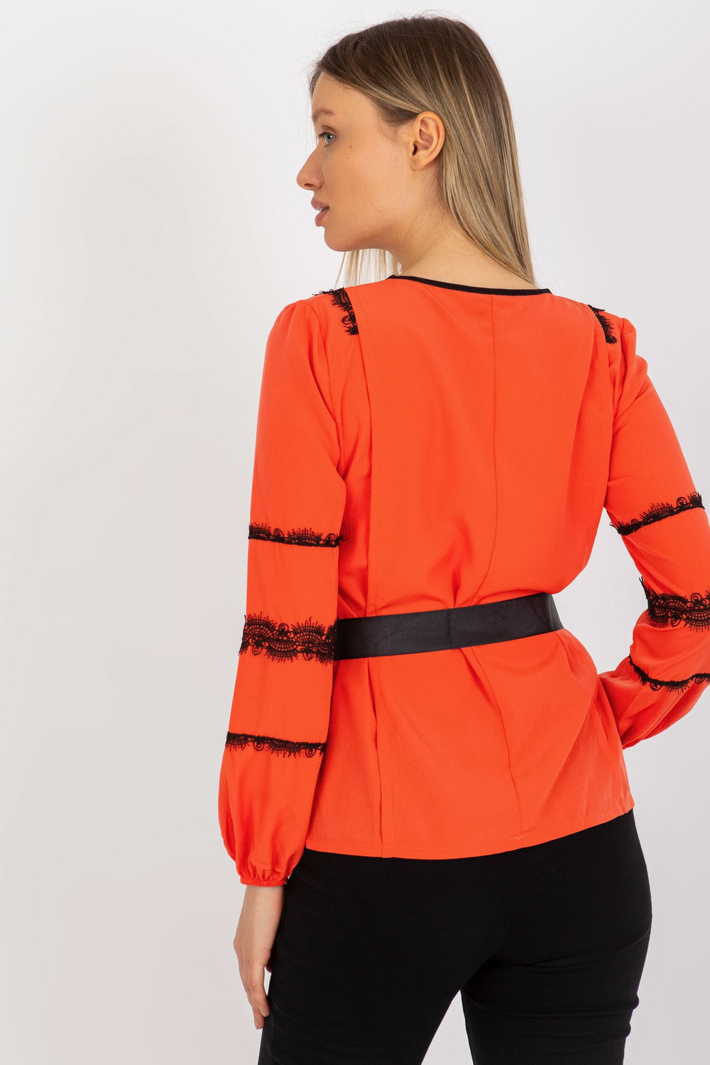 Oranžinė moteriška iškilminga palaidinė su surišamu diržu.