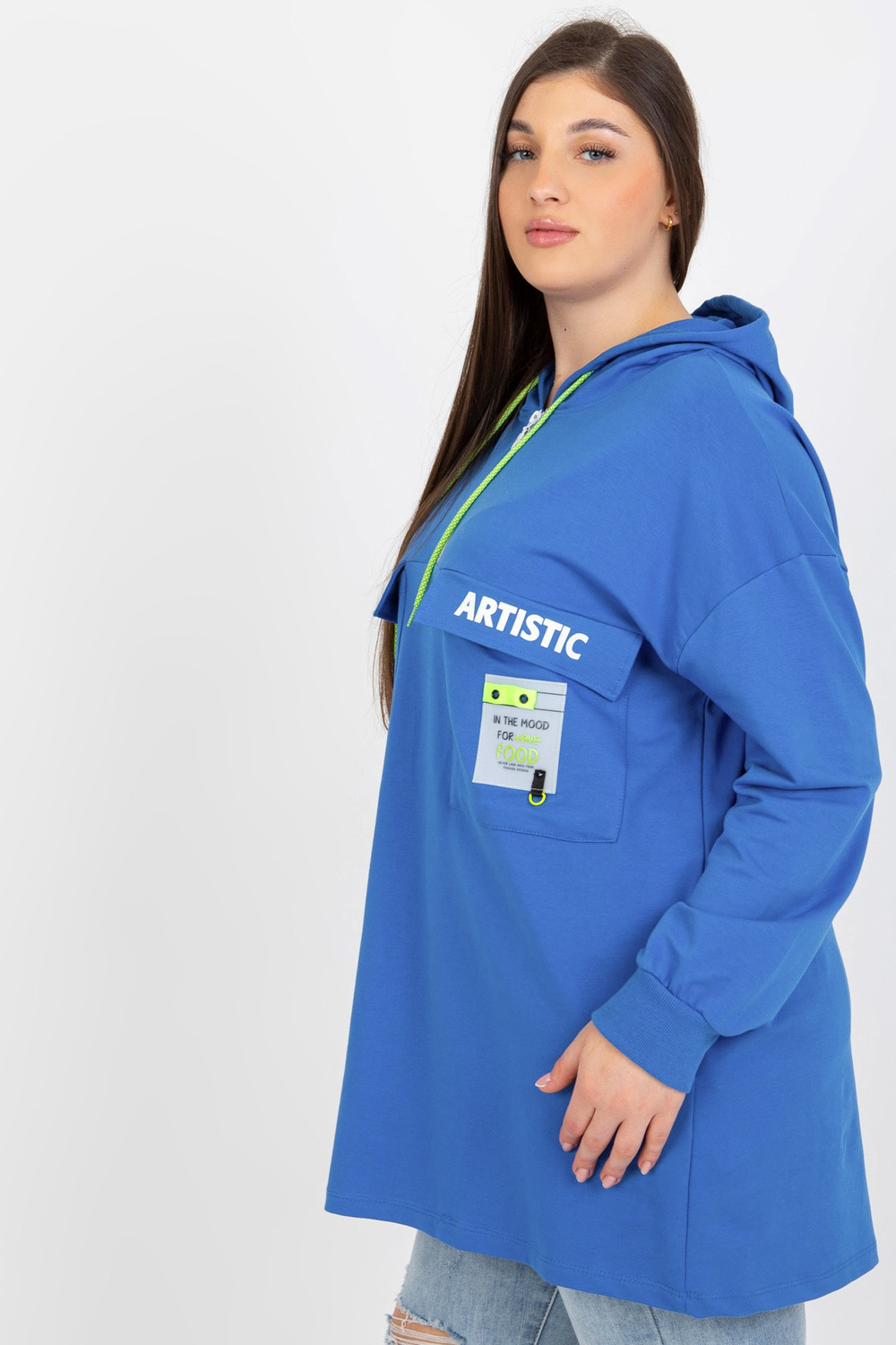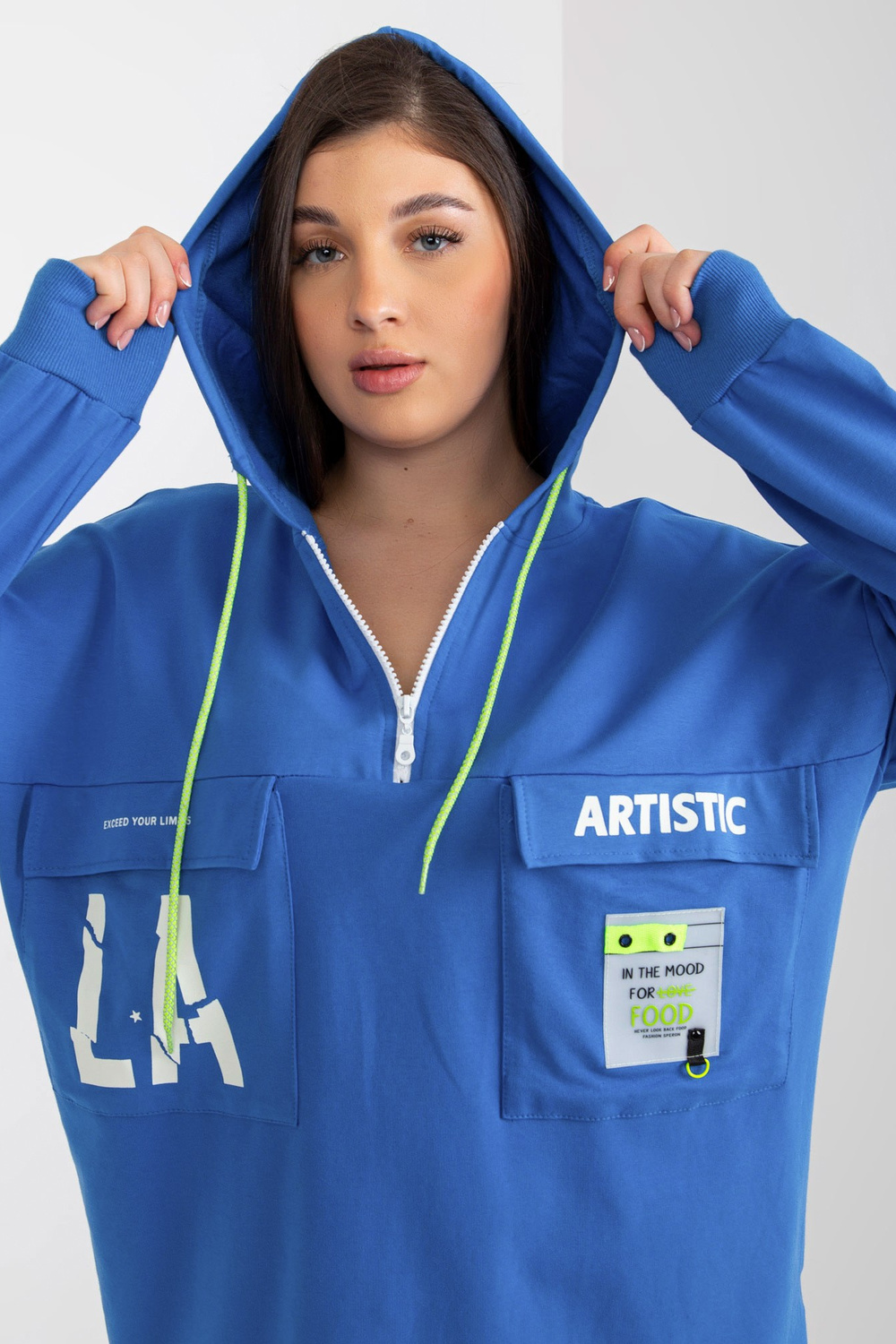 - Modelis dėvi vieno dydžio dydį. Modelio išmatavimai: ūgis 174 cm, krūtinė 100 cm, juosmuo 74 cm, klubai 107 cm