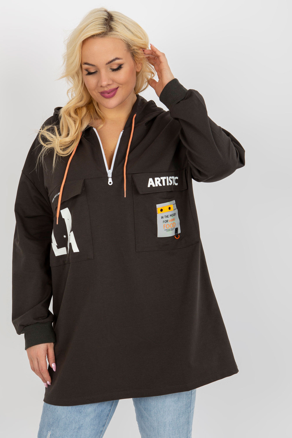 Chaki spalvos ilgesnis plius dydžio megztinis su kišenėmis.