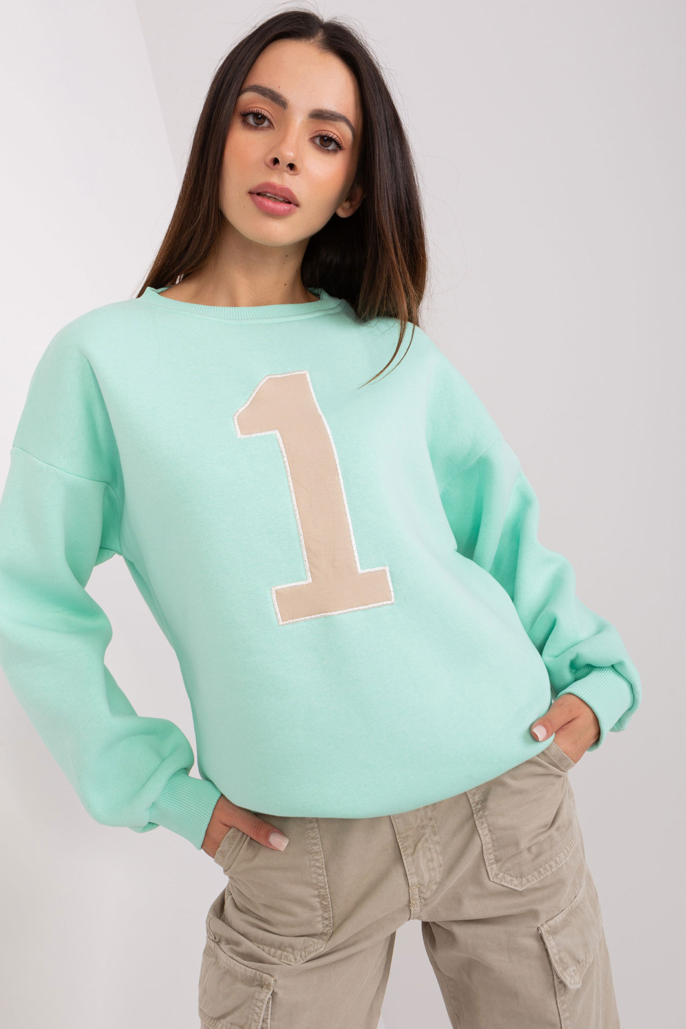 Modelis dėvi vieno dydžio dydį. Modelio išmatavimai: ūgis 175 cm, krūtinė 84 cm, juosmuo 61 cm, klubai 91 cm.