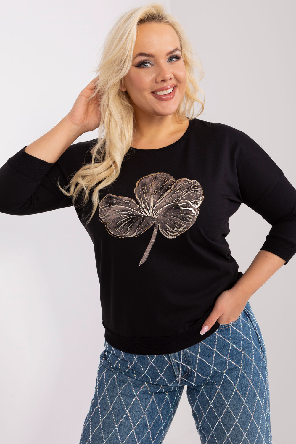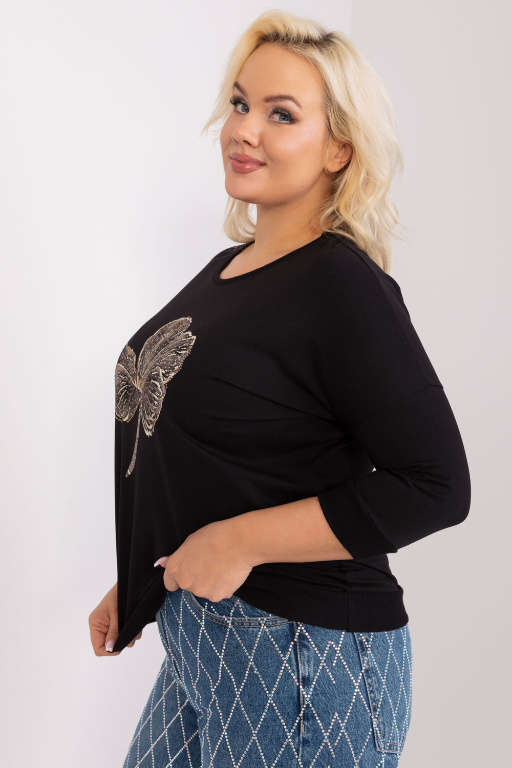 Juoda plius dydžio palaidinė su blizgiu raštu .