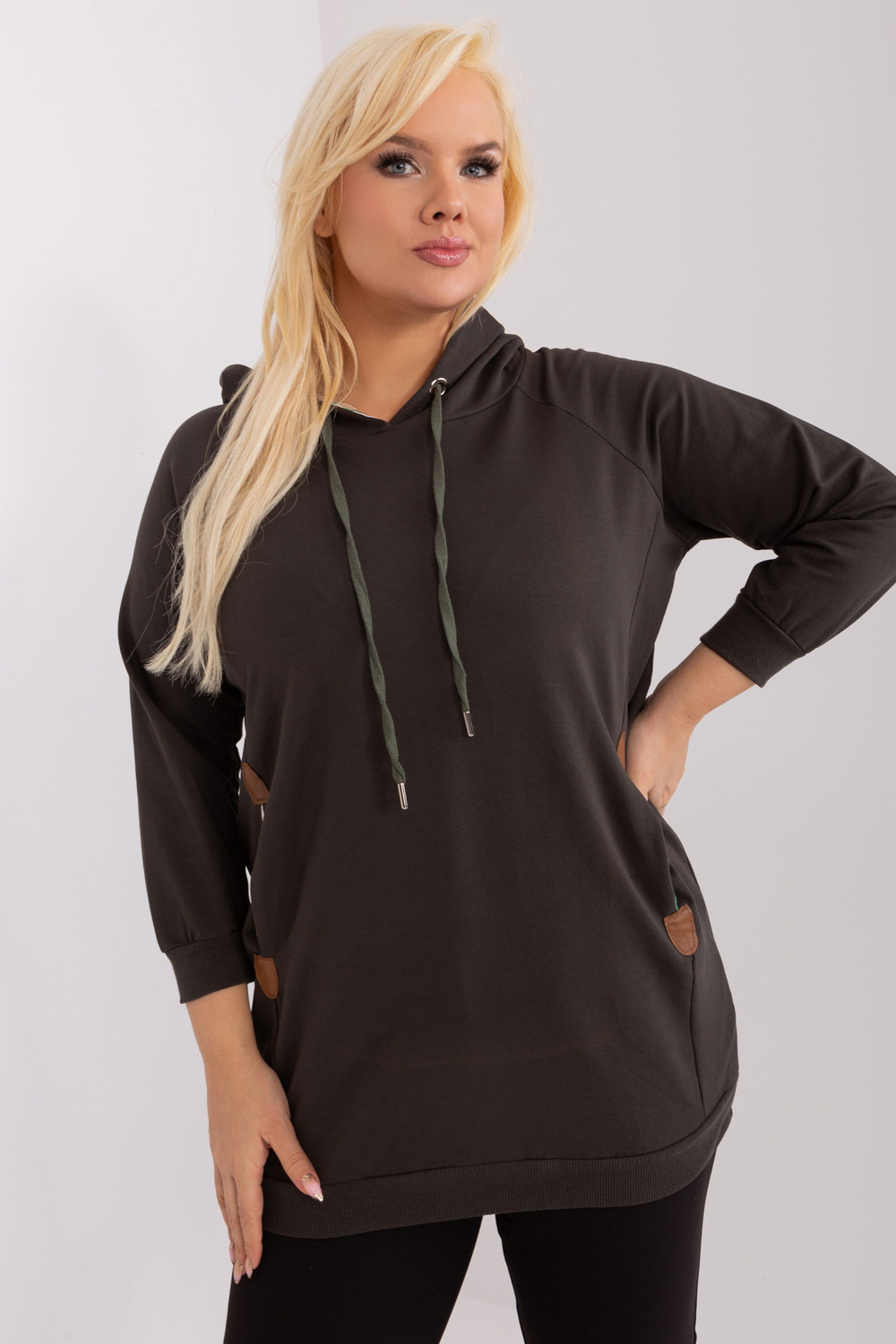 Vieno dydžio megztinio matmenys išmatuoti plokščiai: pažasties plotis - 58 cm, rankovių ilgis - 50 cm, bendras ilgis - 73 cm.