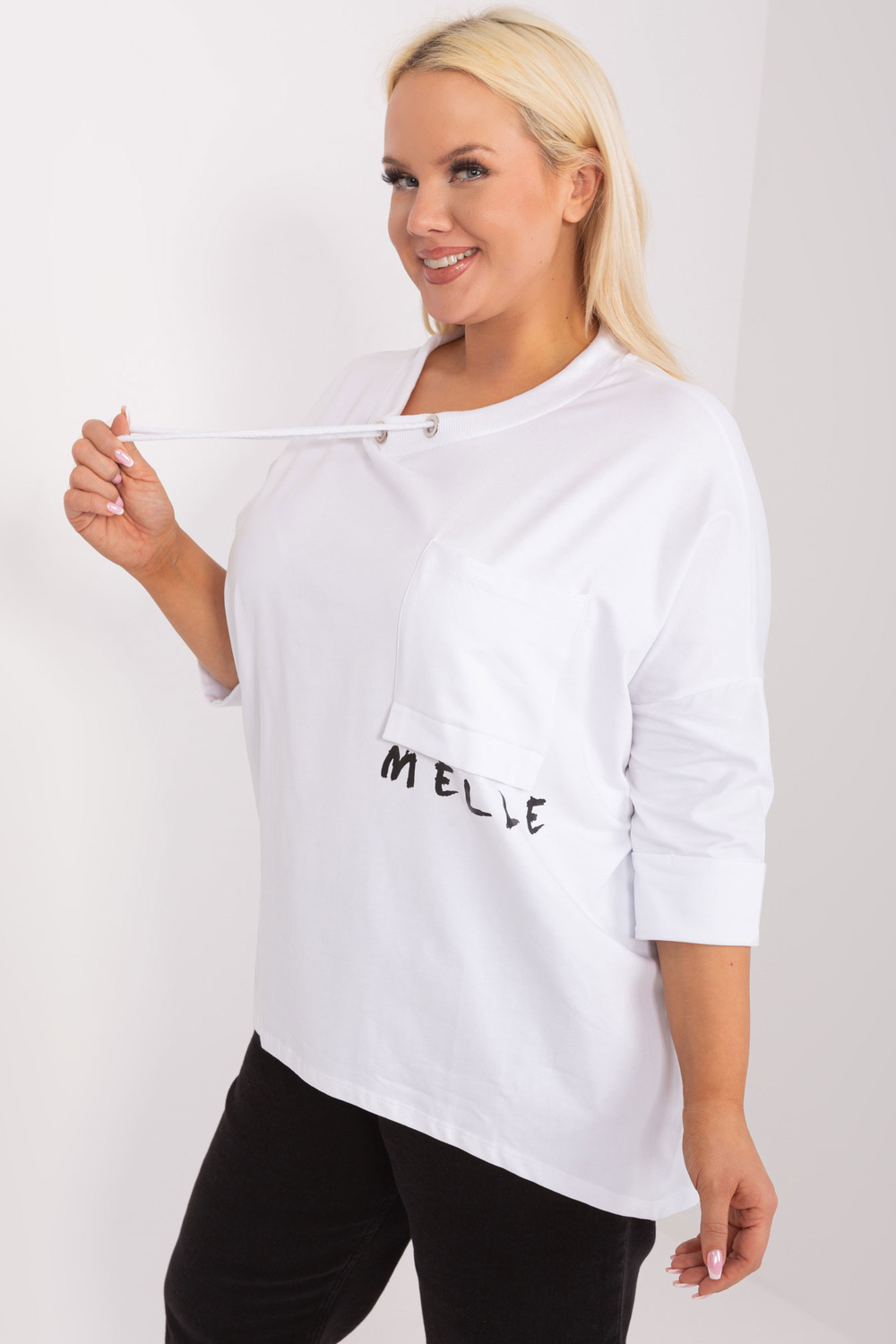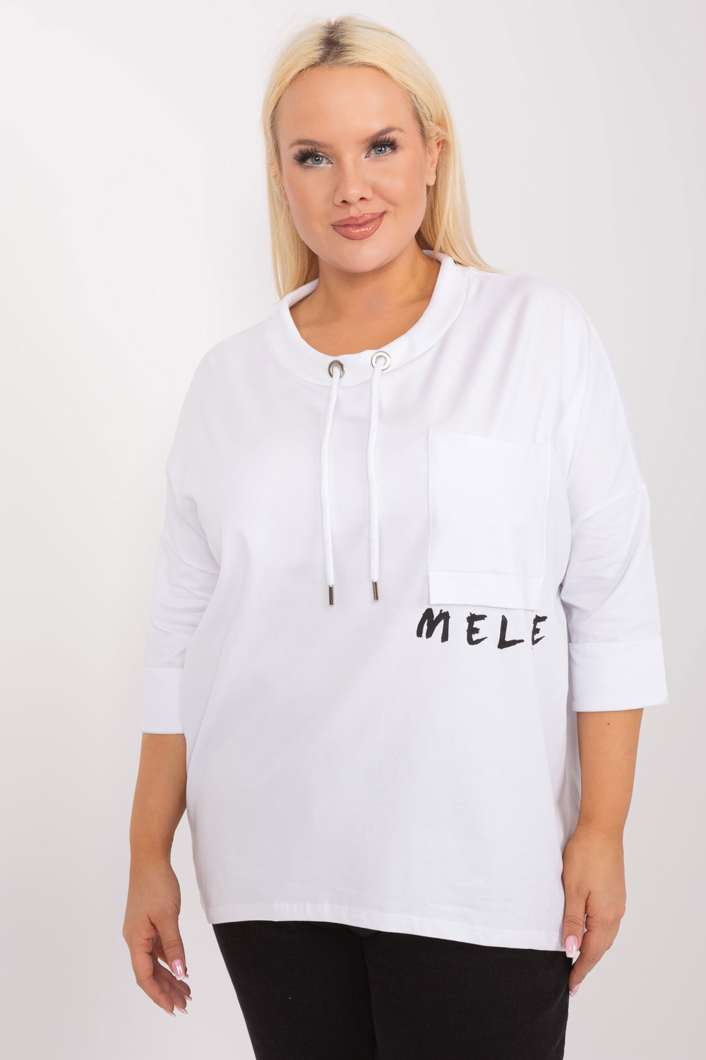 Modelis dėvi vieno dydžio dydį. Modelio išmatavimai: ūgis 172 cm, krūtinė 103 cm, juosmuo 73 cm, klubai 103 cm.