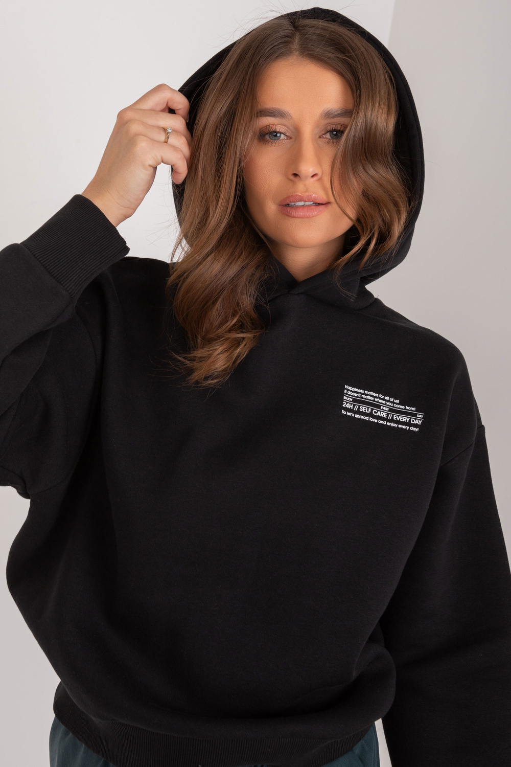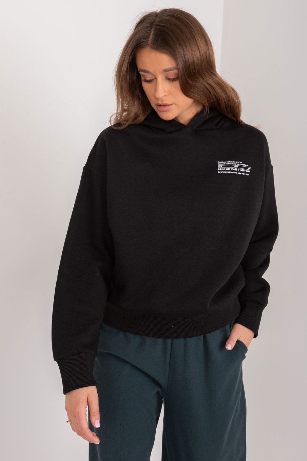 Modelis dėvi S dydį. Modelio išmatavimai: ūgis 176 cm, krūtinė 85 cm, juosmuo 64 cm, klubai 92 cm.