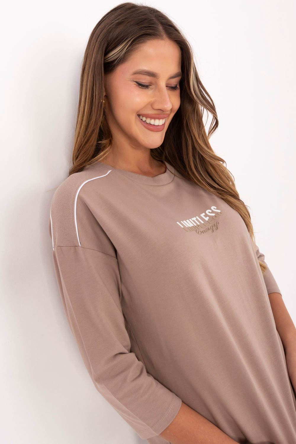 Modelis dėvi vieno dydžio rūbą. Modelio matmenys: ūgis 176 cm, krūtinė 90 cm, liemuo 62 cm, klubai 94 cm.