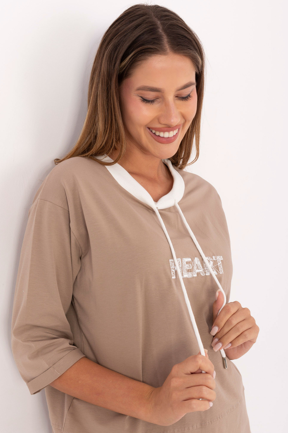 Palaidinės vieno dydžio matmenys matuojant padėtą ant lygaus paviršiaus: plotis po pažastimis - 60 cm, rankovės ilgis - 36 cm (nuo siūlės), plotis klubų srityje - 58 cm, bendras ilgis - 70 cm.