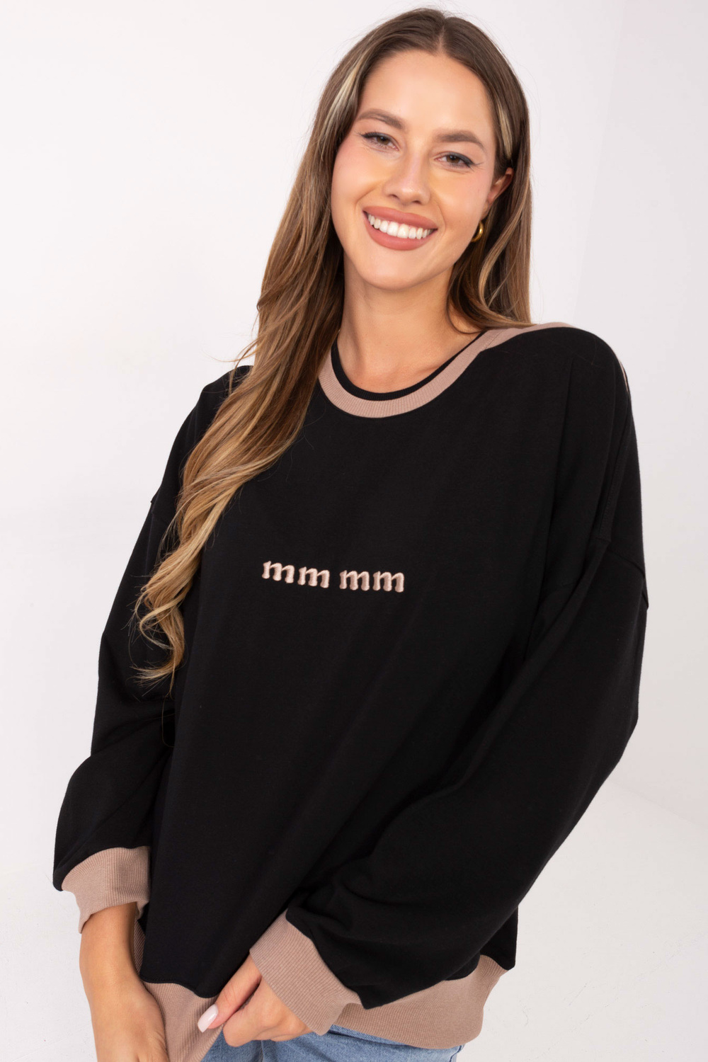 Džemperio matmenys vieno dydžio, matuojami padėjus plokščiai: plotis po pažastimis - 67 cm, rankovės ilgis - 49 cm (nuo siūlės), plotis ties klubais - 54 cm, bendras ilgis - 71 cm.