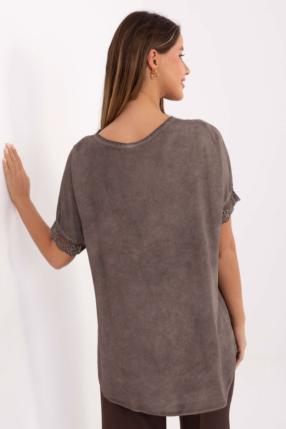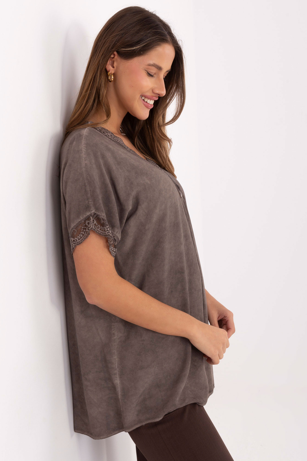 Marškinėlių matmenys one size dydžiu, matuoti išlygintus: plotis po pažastimis – 64 cm, bendras ilgis – 76 cm, plotis per klubus – 65 cm, rankovės ilgis – 29 cm.
