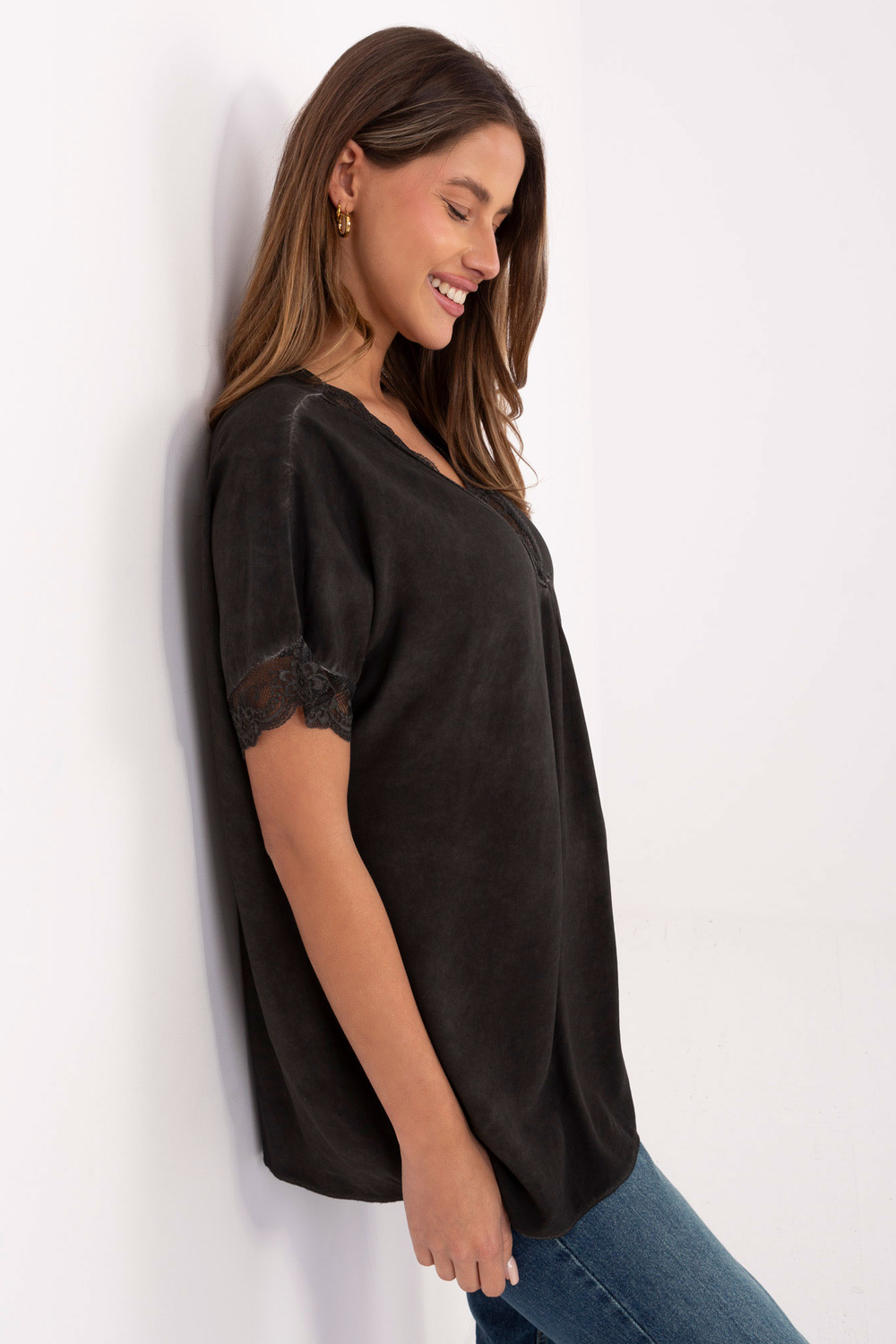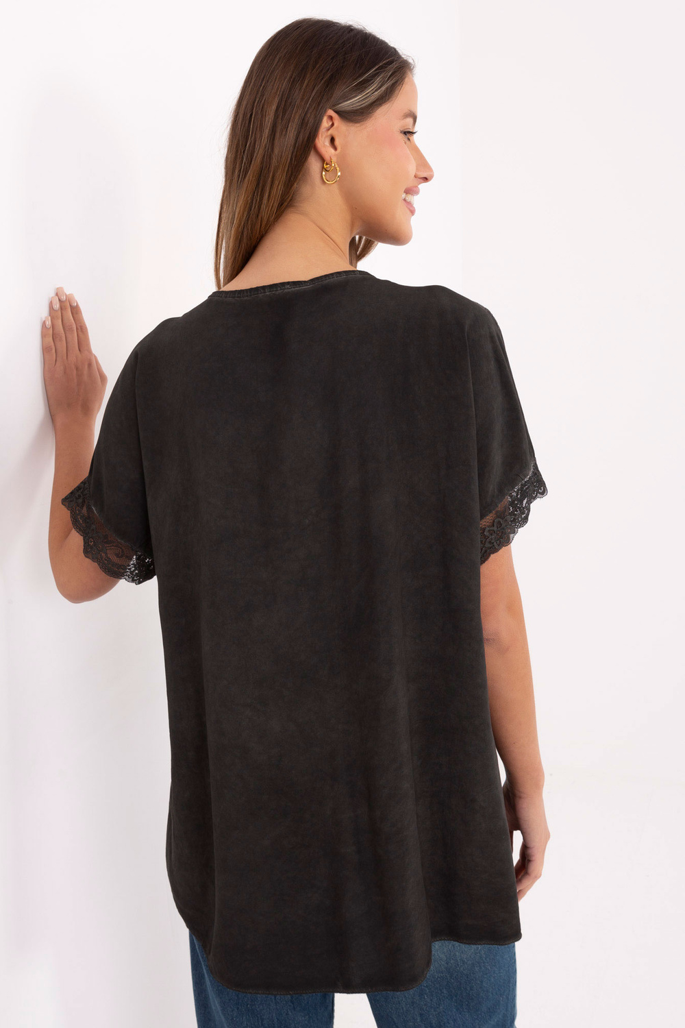 Vieno dydžio palaidinės matmenys, matuoti išlygintus: plotis po pažastimis - 64 cm, bendras ilgis - 76 cm, plotis klubų srityje - 65 cm, rankovės ilgis - 29 cm.
