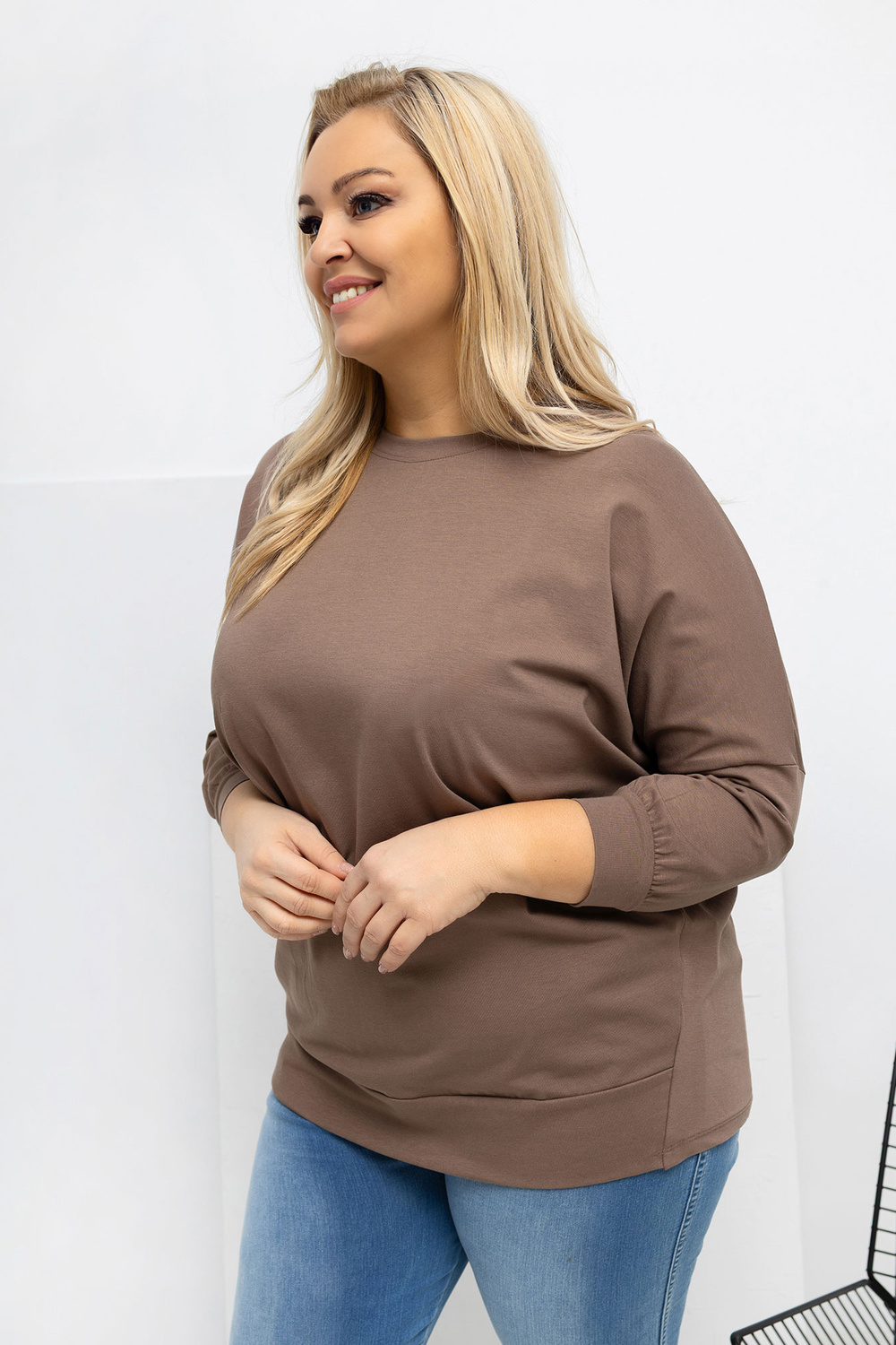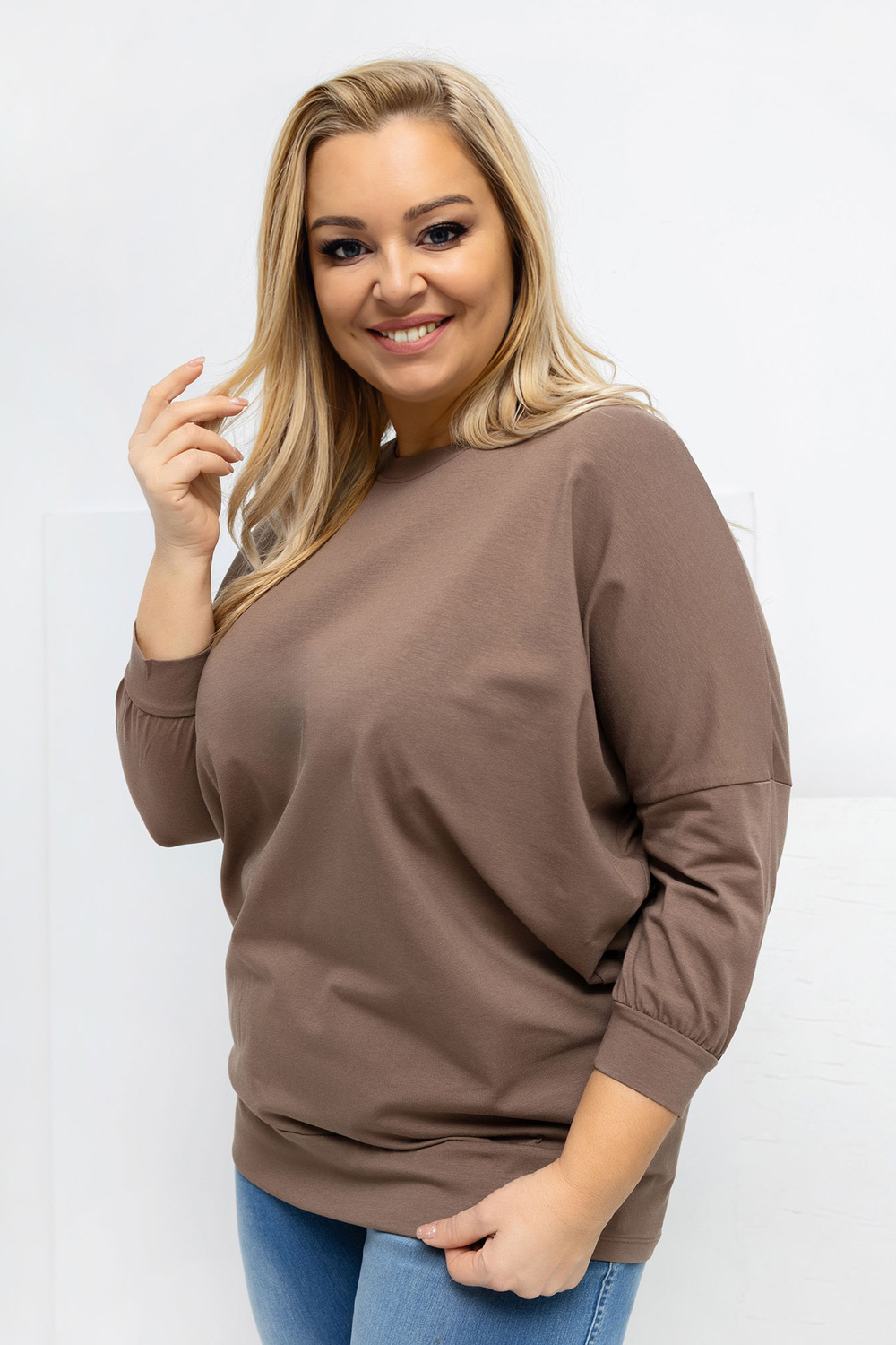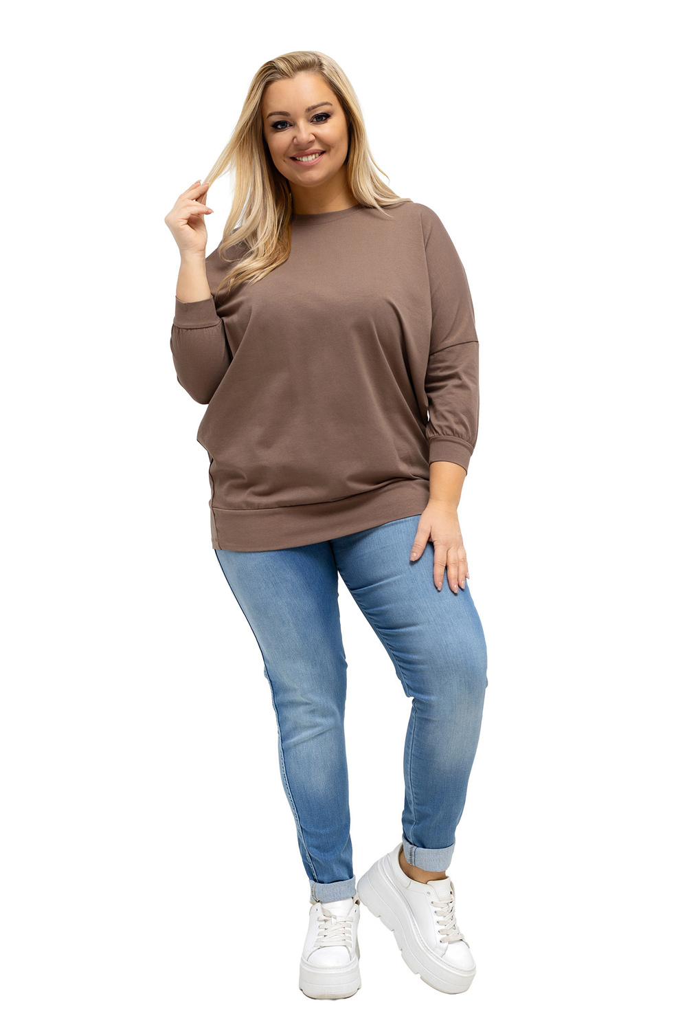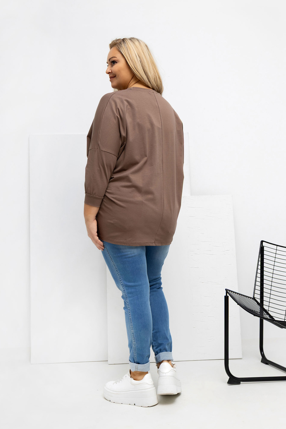 Modelis dėvi vieno dydžio drabužį. Modelio matmenys: ūgis 167 cm, krūtinė 118 cm, liemuo 90 cm, klubai 118 cm.