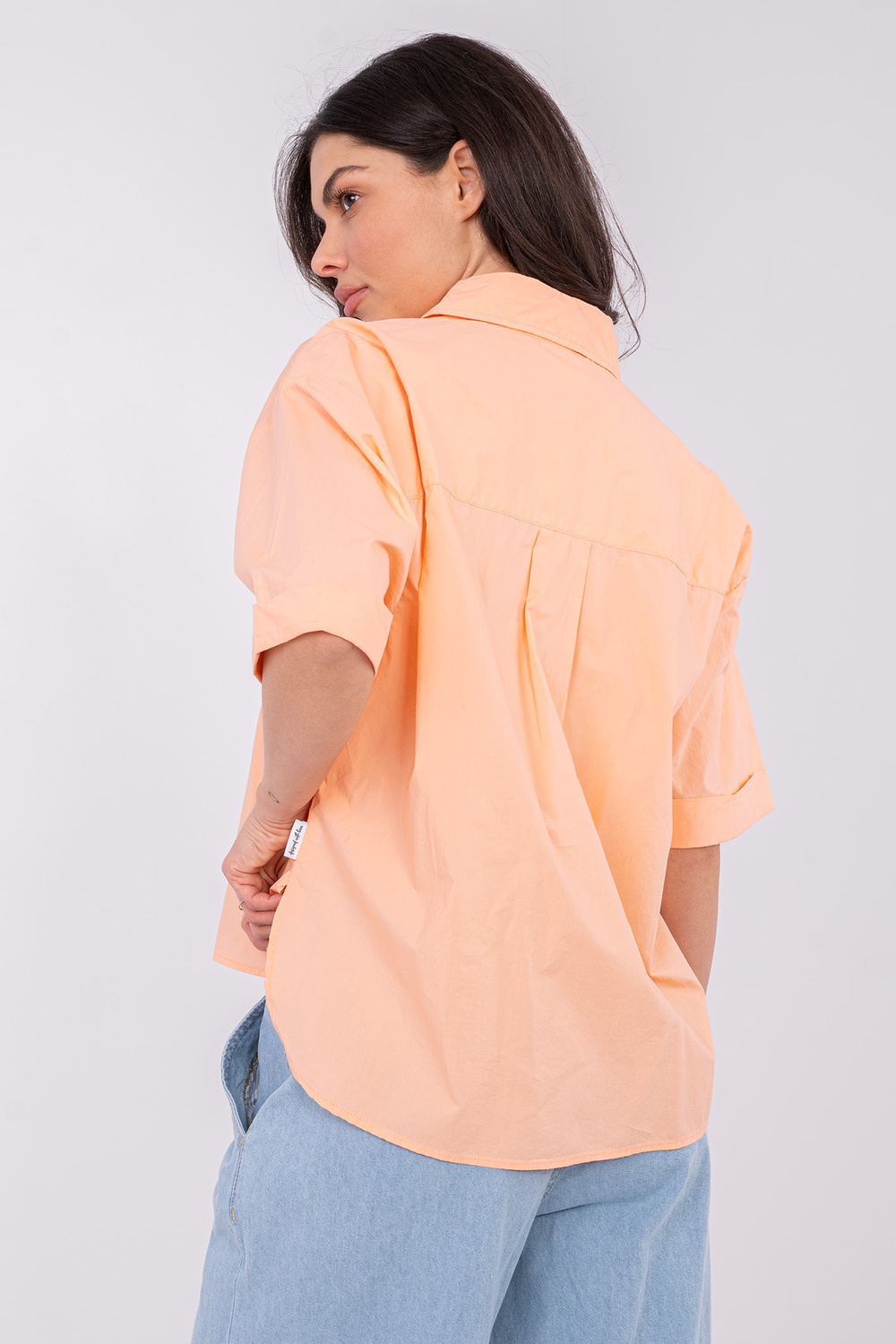 Marškinio matmenys S dydžio, matuoti išlygintus: plotis po pažastimis - 59 cm, bendras ilgis - 57 cm (priekyje), bendras ilgis - 65 cm (nugarėlėje), plotis klubuose - 61 cm, rankovės ilgis - 24 cm.