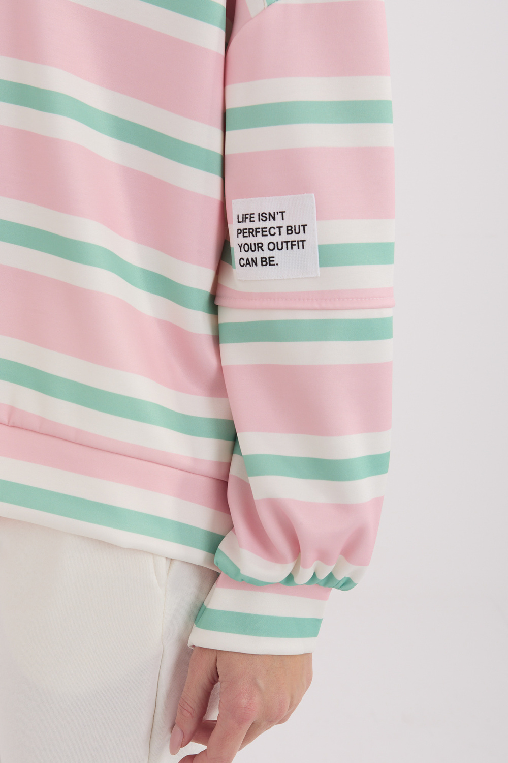 Modelis dėvi vieno dydžio drabužį. Modelio matmenys: ūgis 169 cm, krūtinė 88 cm, liemuo 68 cm, klubai 89 cm.