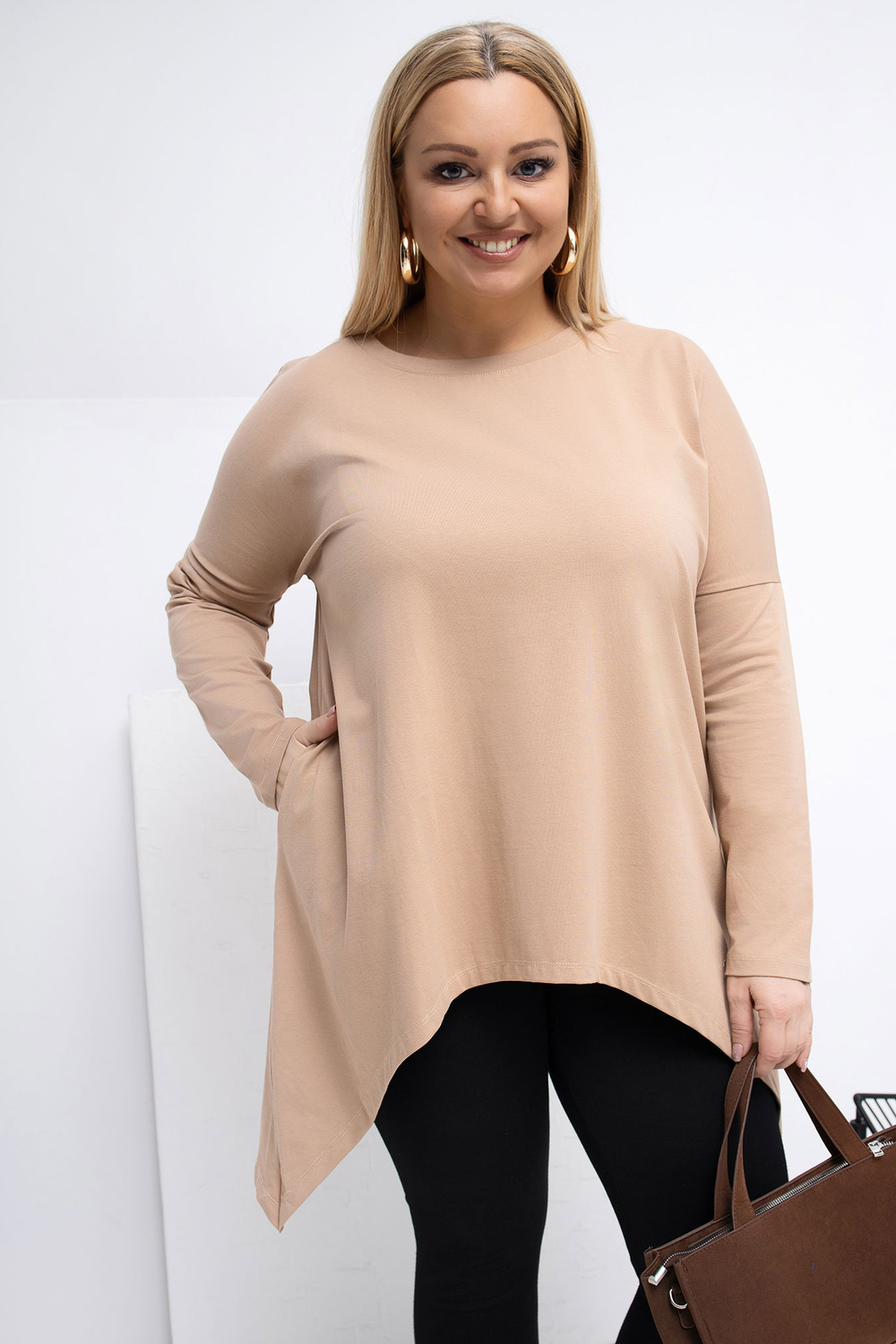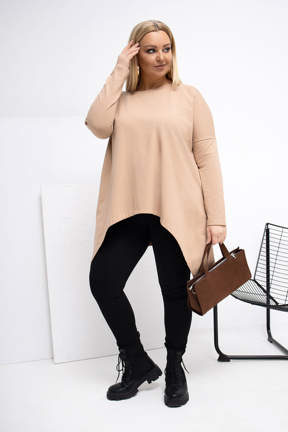 Modelis dėvi vieno dydžio XL/2XL drabužį. Modelio išmatavimai: ūgis 167 cm, krūtinė 118 cm, liemuo 90 cm, klubai 118 cm .