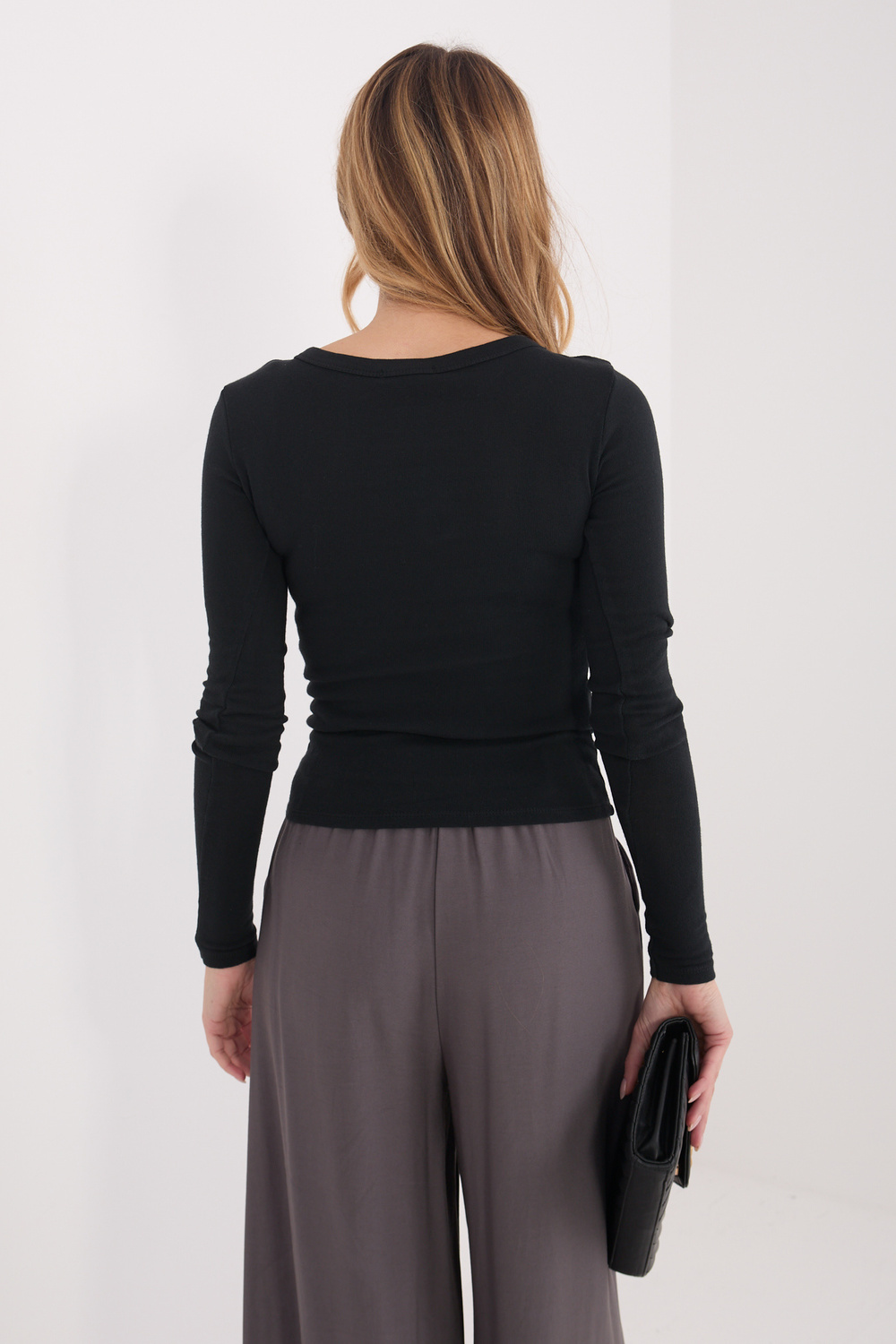 Modelis dėvi vieno dydžio drabužį. Modelio matmenys: ūgis 169 cm, krūtinė 88 cm, liemuo 68 cm, klubai 89 cm .
