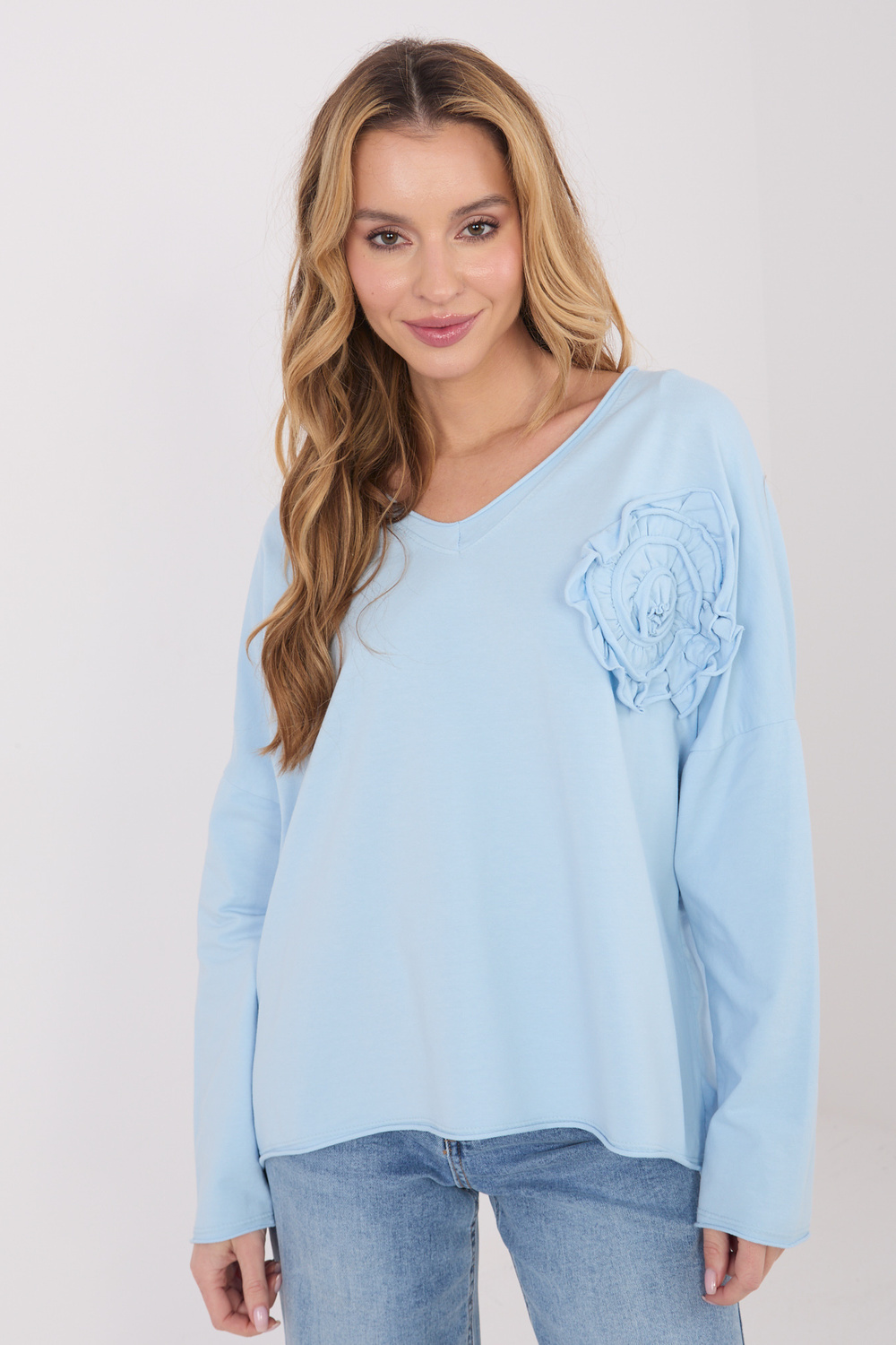 Modelis dėvi vieno dydžio drabužį. Modelio išmatavimai: aukštis 169 cm, krūtinė 88 cm, liemuo 68 cm, klubai 89 cm.