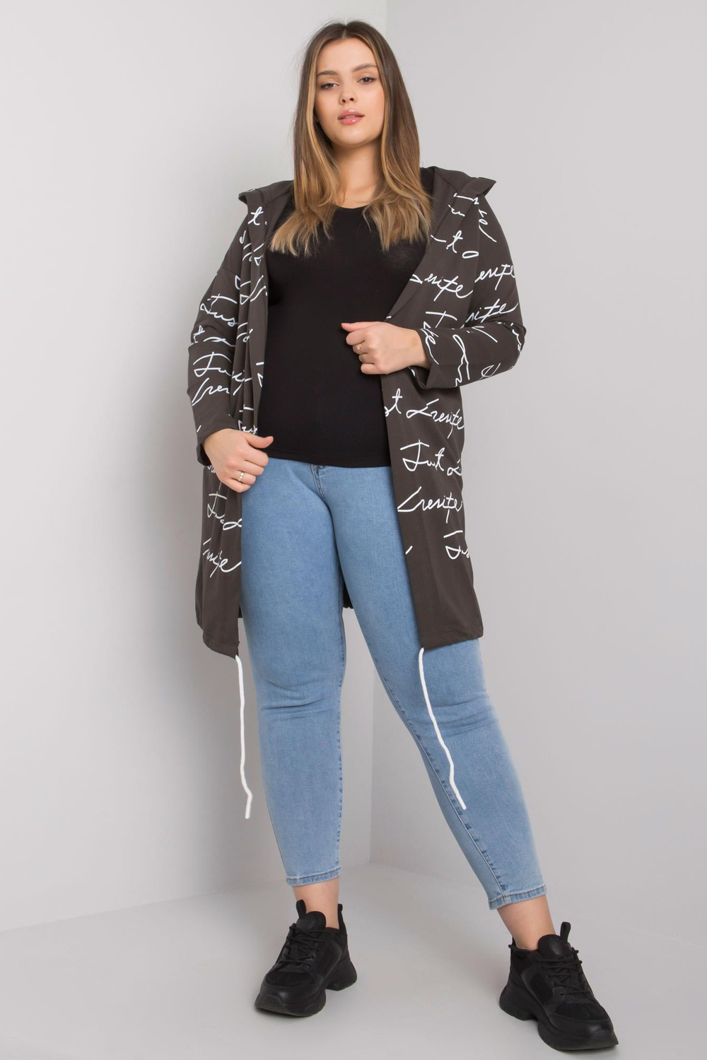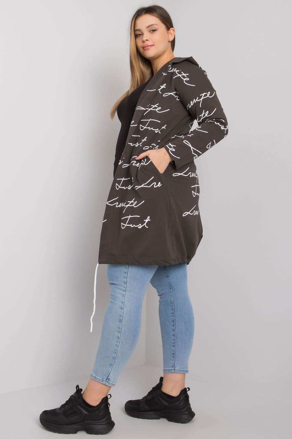 Modelis dėvi vieno dydžio dydį. Modelio matmenys: aukštis 175 cm, krūtinė 102 cm, juosmuo 89 cm, klubai 120 cm.