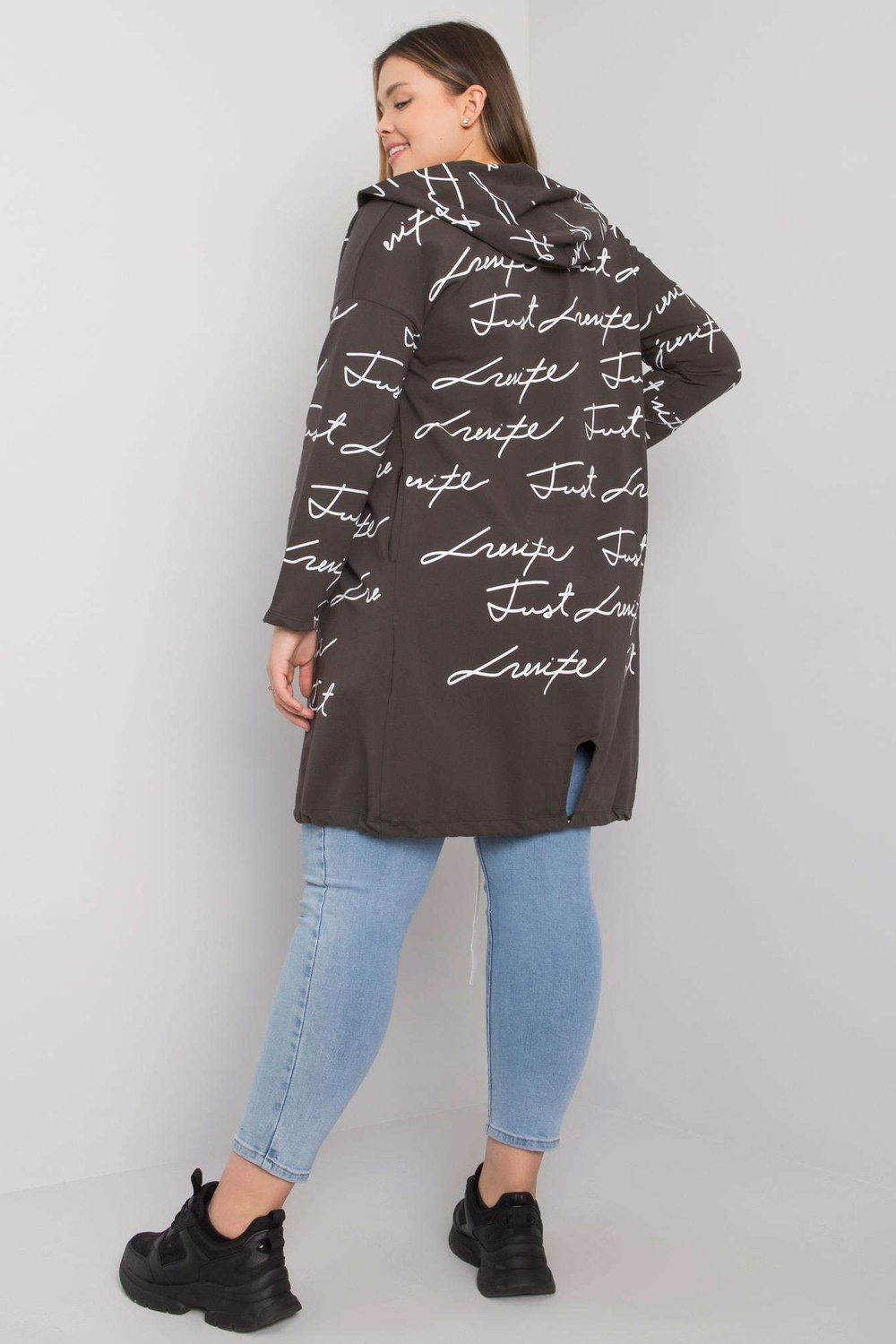 Vieno dydžio megztinio matmenys matuojami plokščiai: plotis po pažastimis - 50 cm, bendras ilgis - 86 cm, rankovių ilgis - 52 cm.