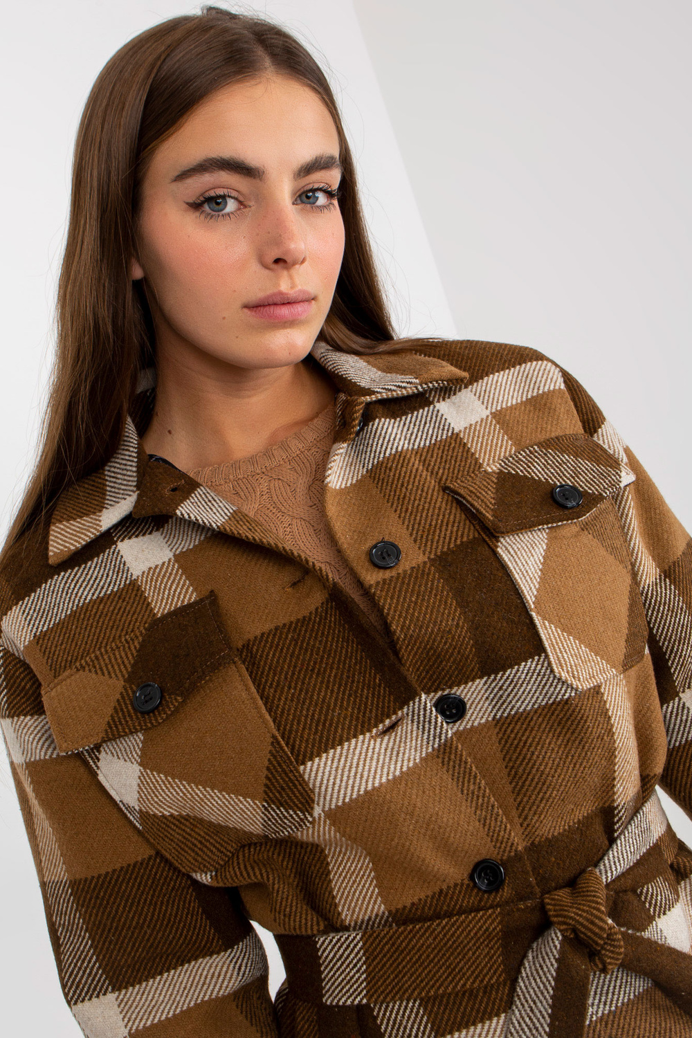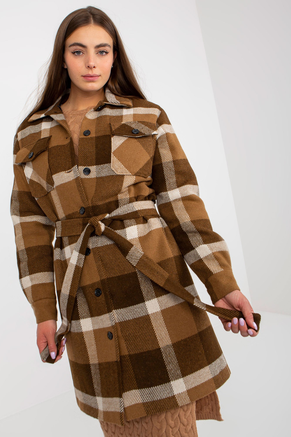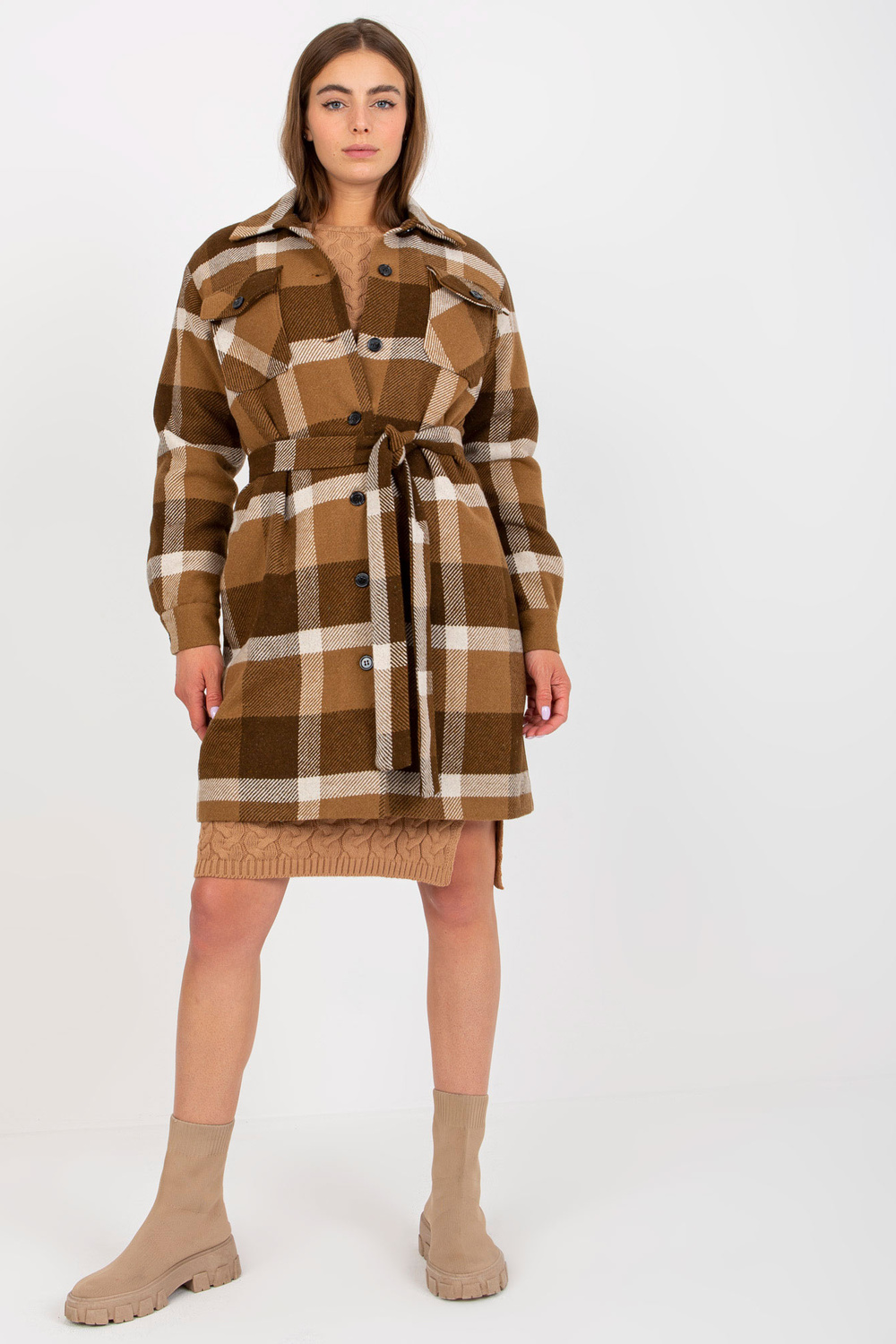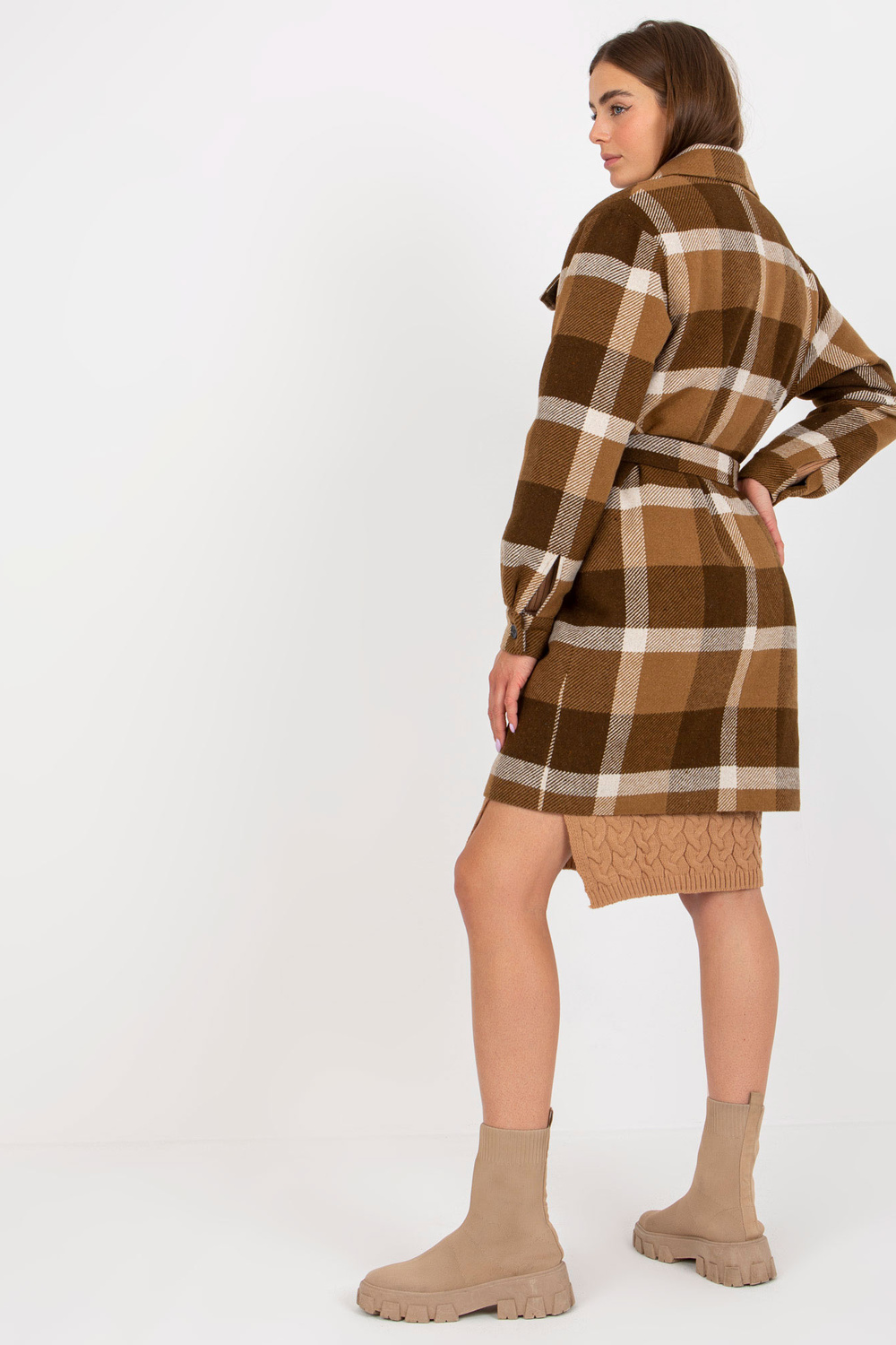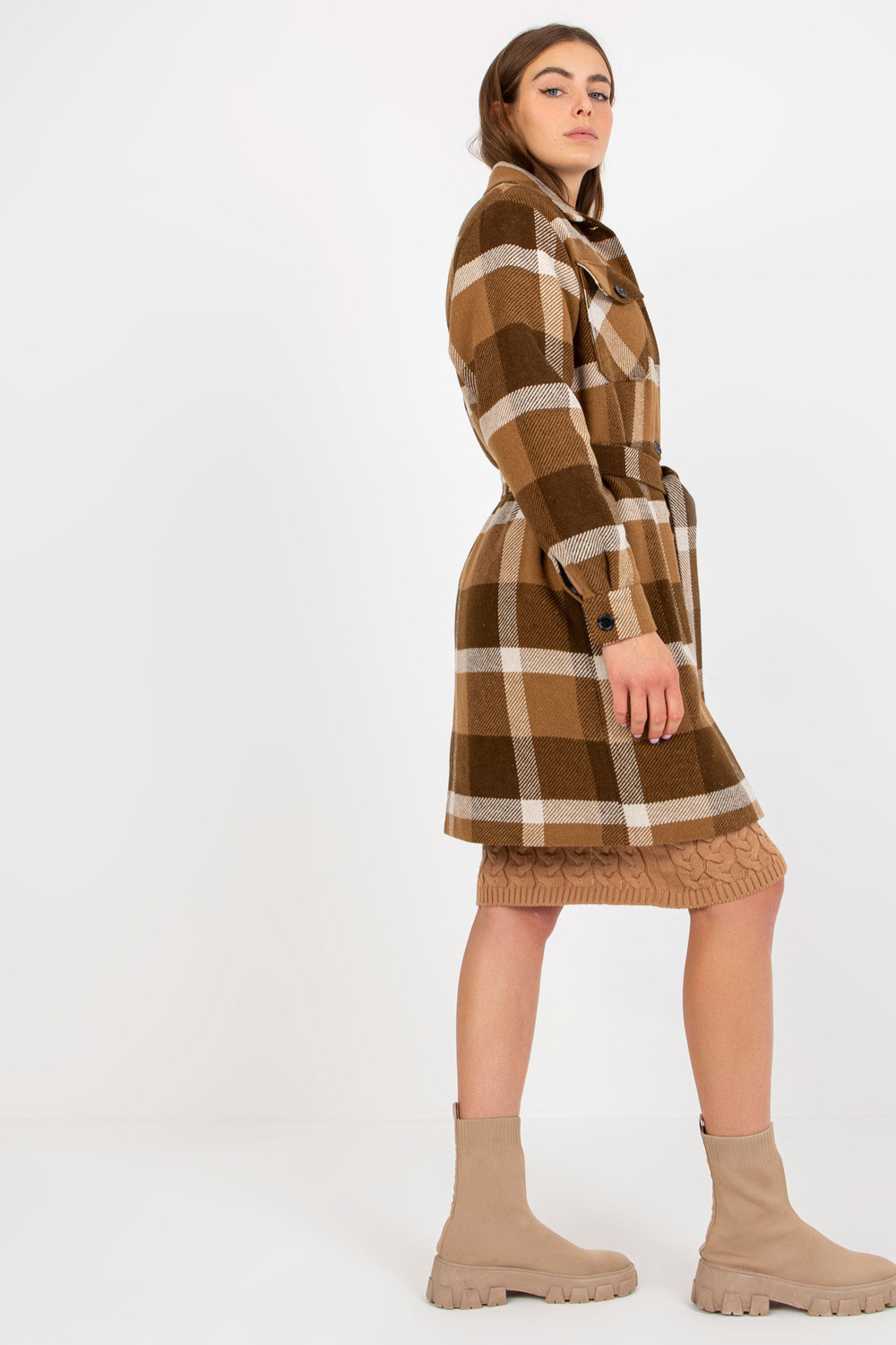 Rudos spalvos moteriškas languotas paltas su rišamu diržu.