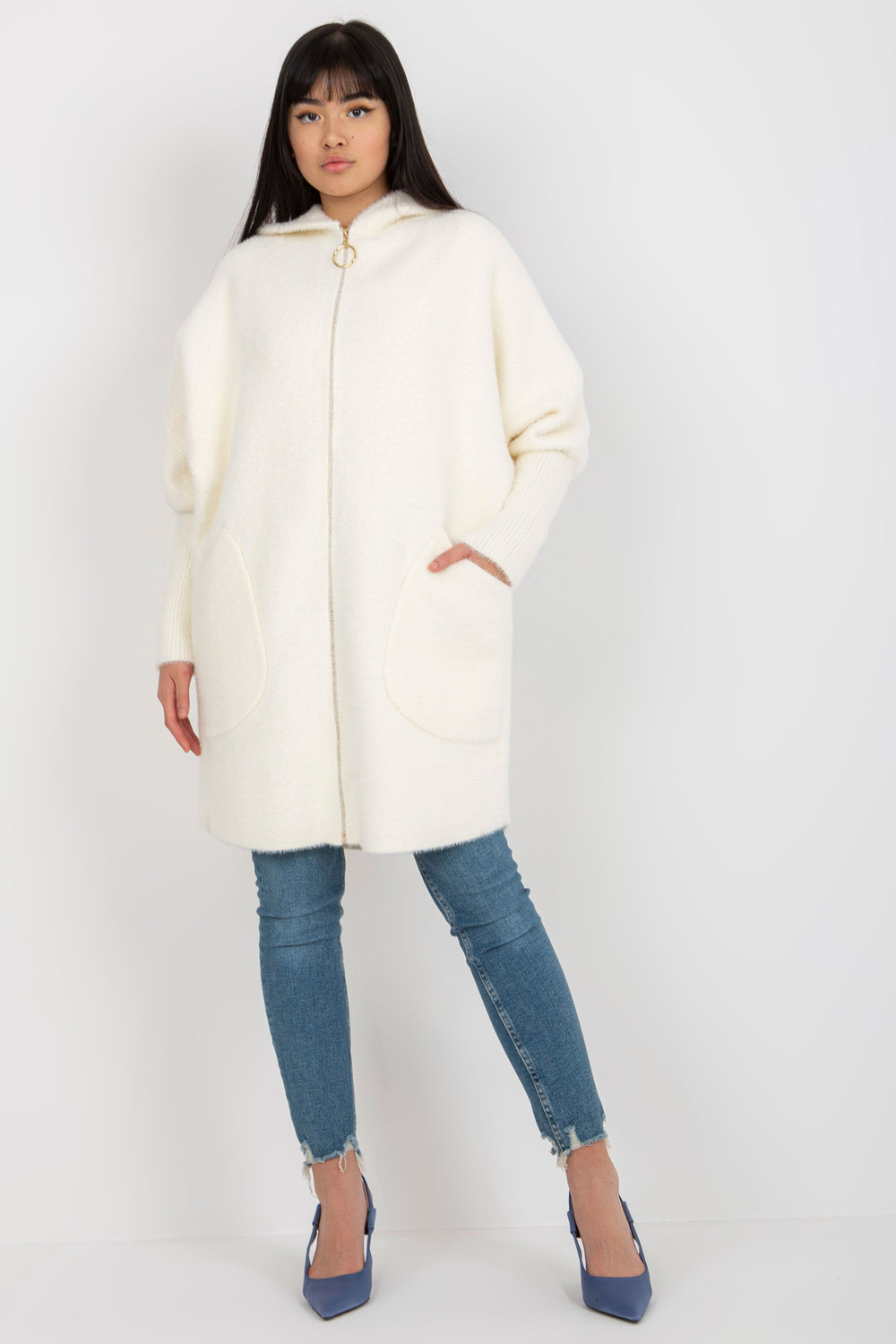 Ecru moteriškas alpakų paltas su kišenėmis ir gobtuvu.
