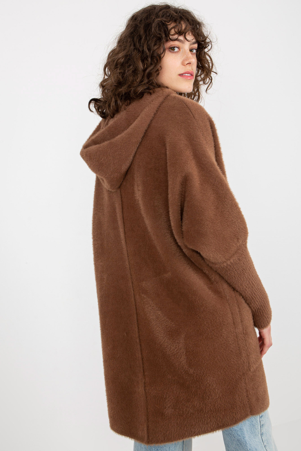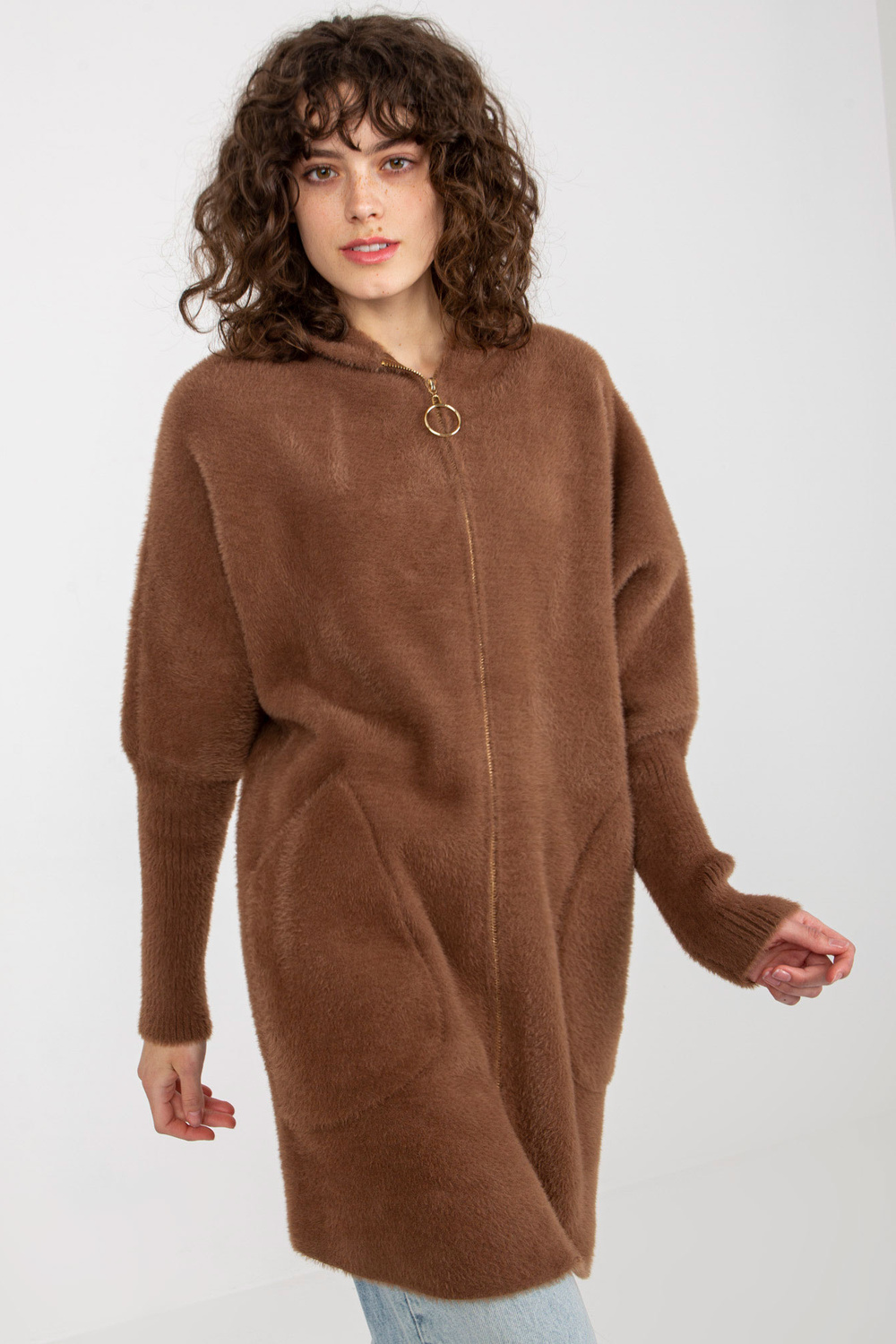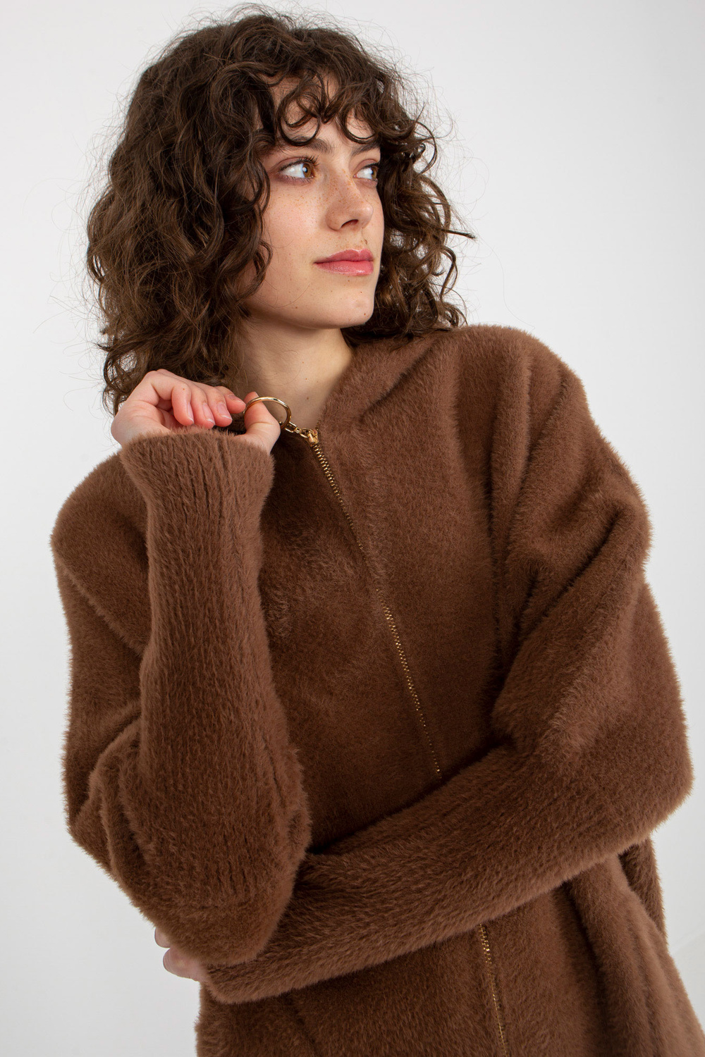 Rudos spalvos moteriškas alpakų paltas su užtrauktuku.