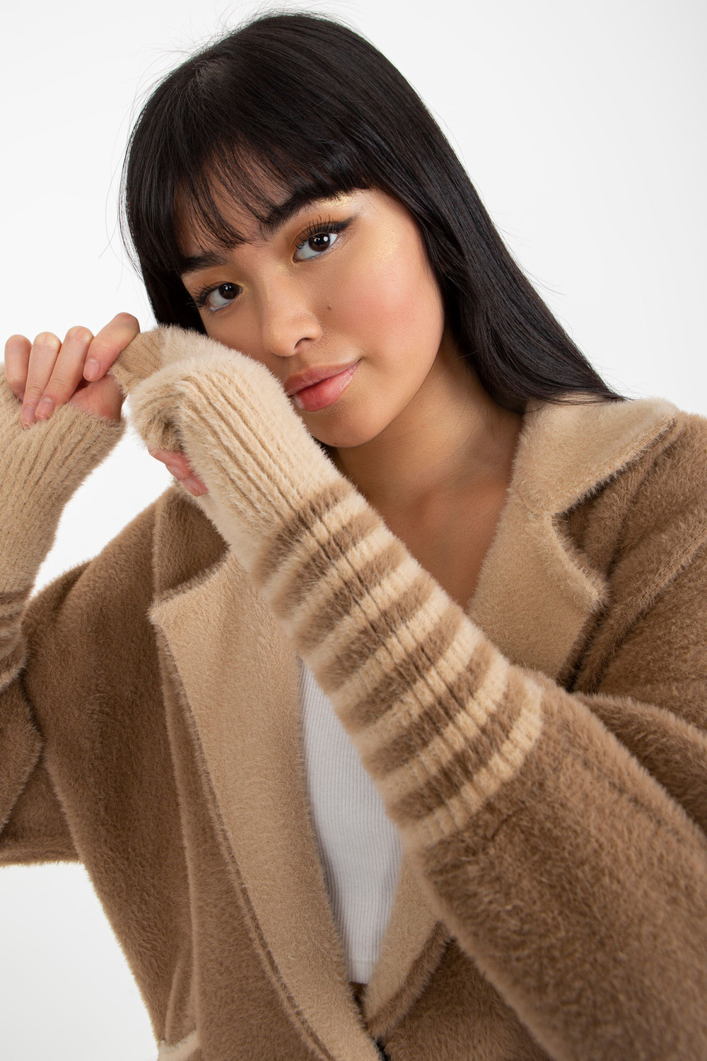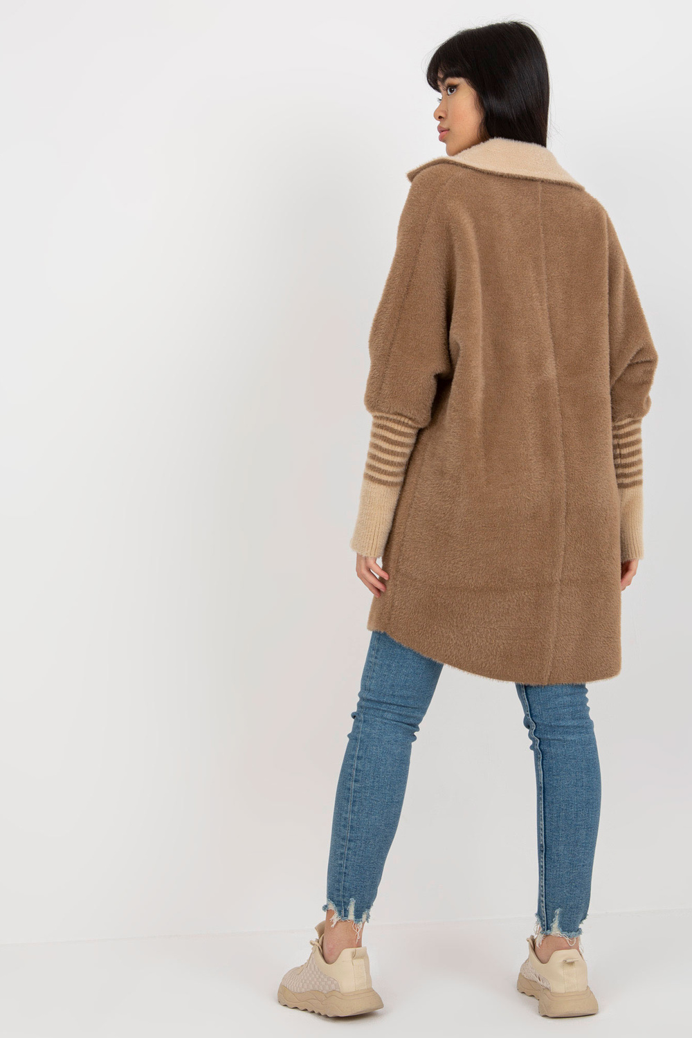 Šviesiai rudas alpakų kailis su užsegimu.
