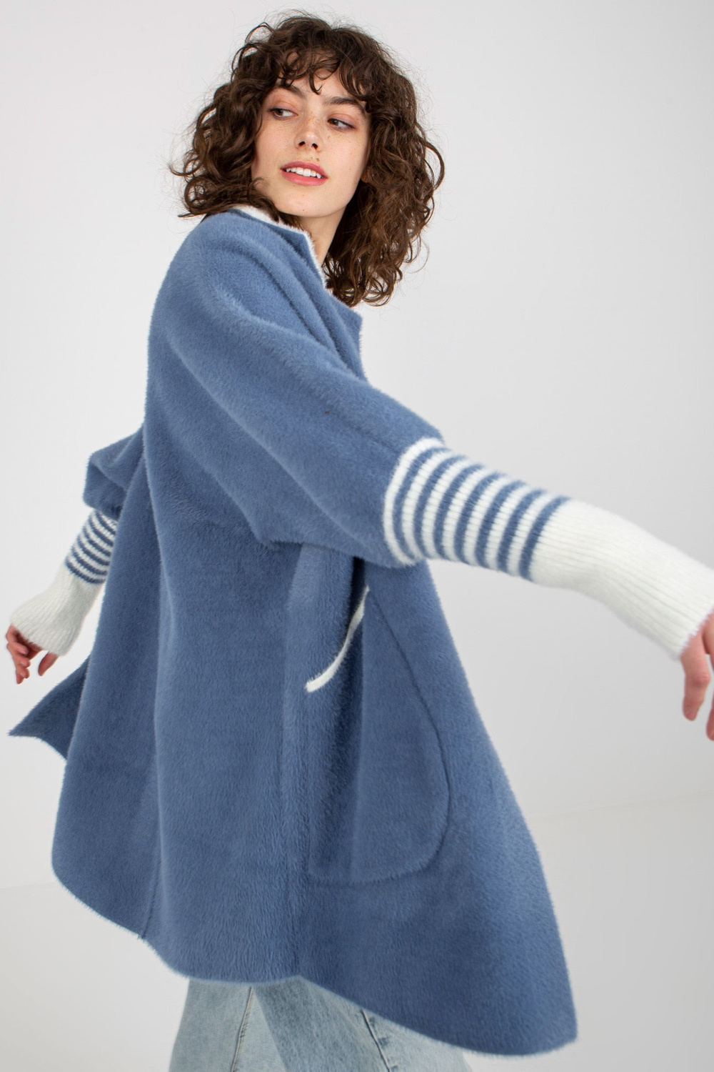 Tamsiai mėlynas moteriškas alpakų paltas su kišenėmis.