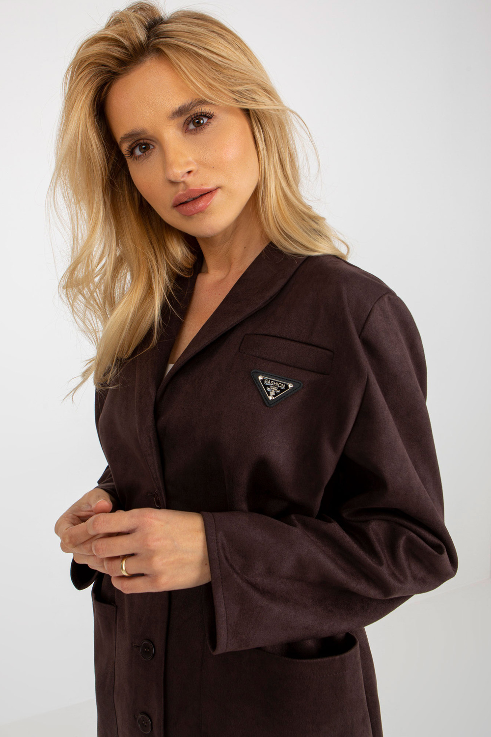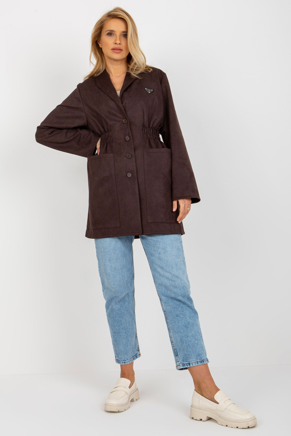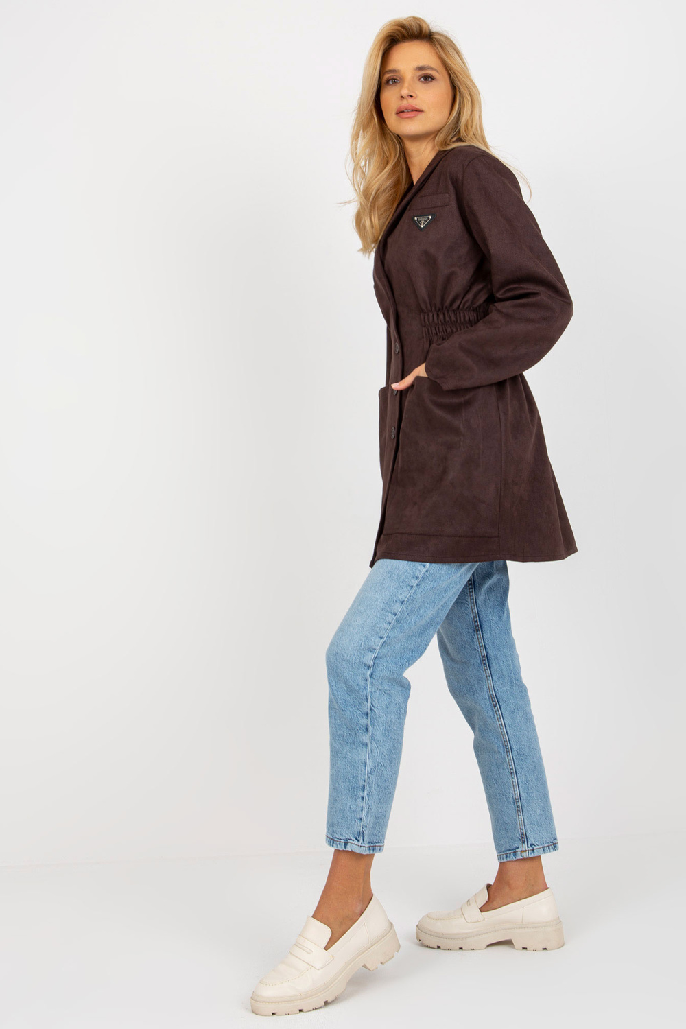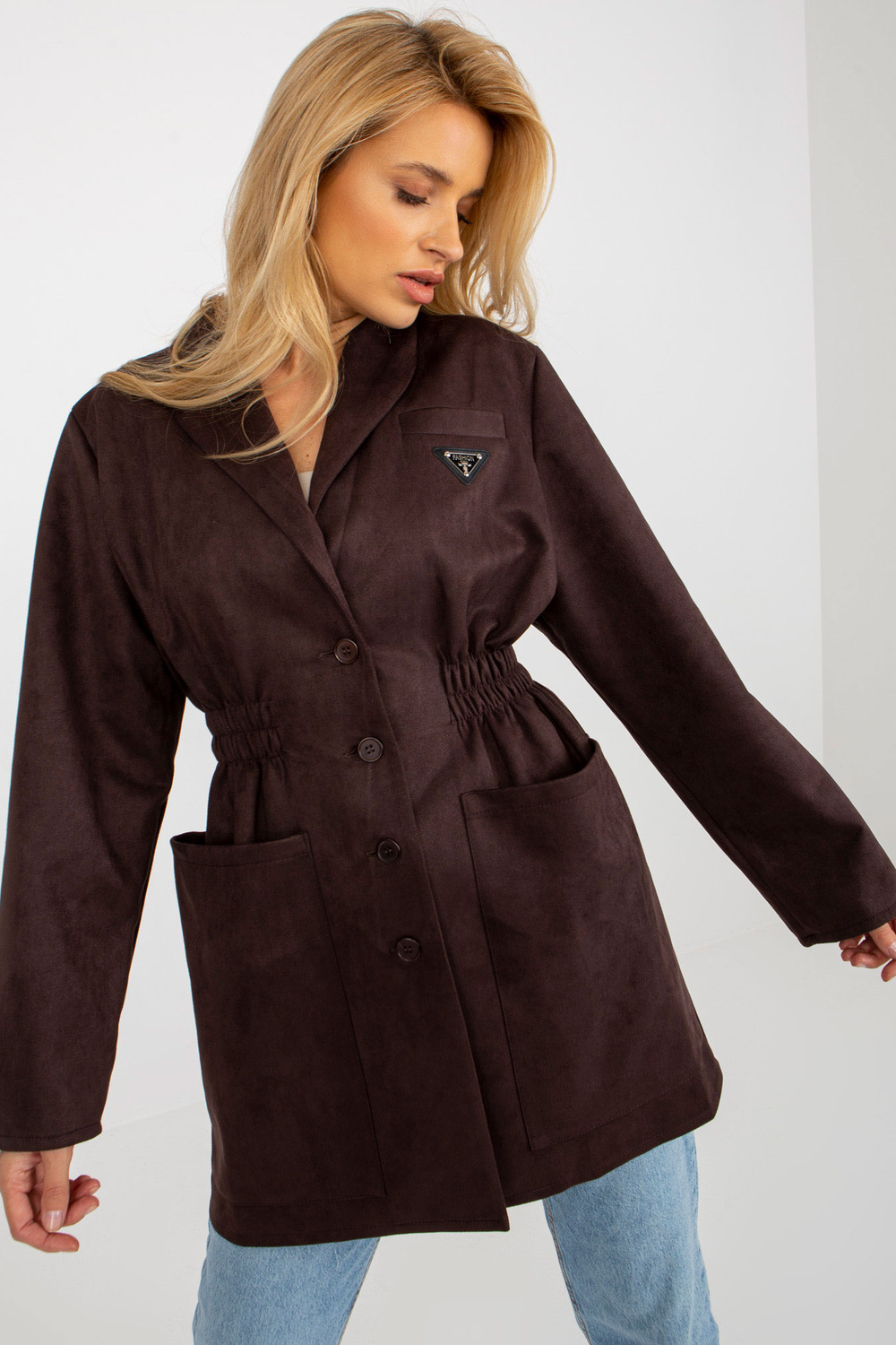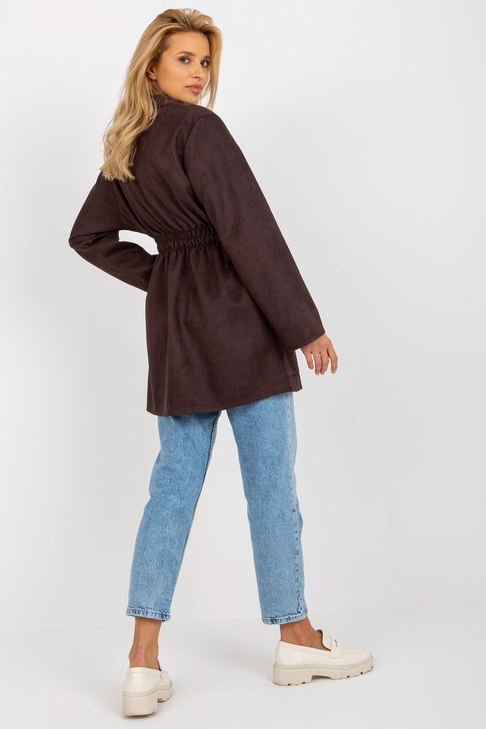 Tamsiai rudas švarkas su elastine juostele ties juosmeniu.
