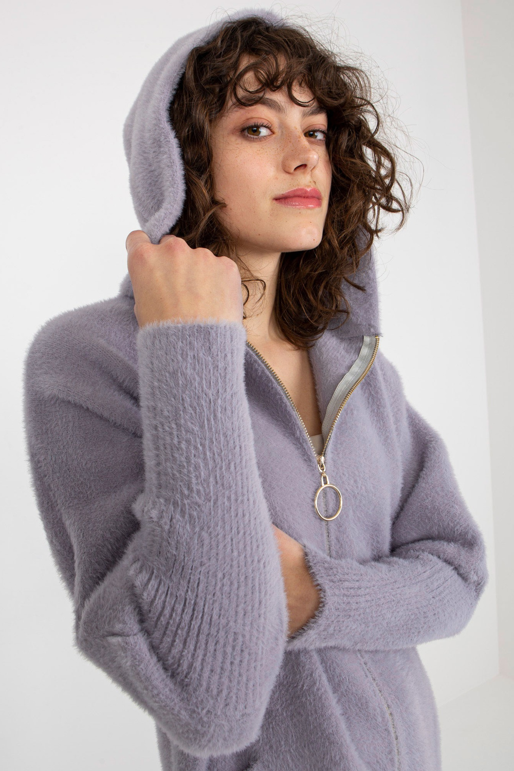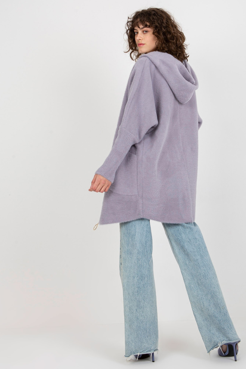 Šviesiai violetinis moteriškas alpakų paltas su kišenėmis.
