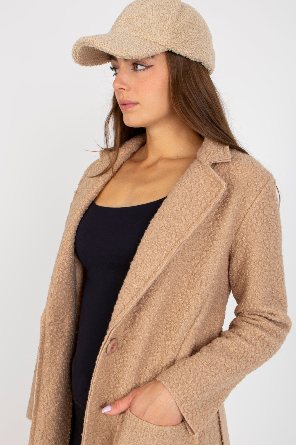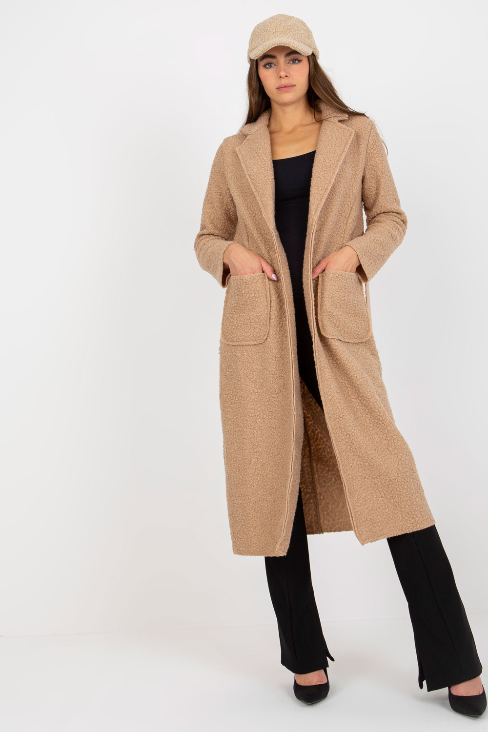 Smėlio spalvos pliušinis maksi paltas su įrišimu Merve OCH BELLA.
