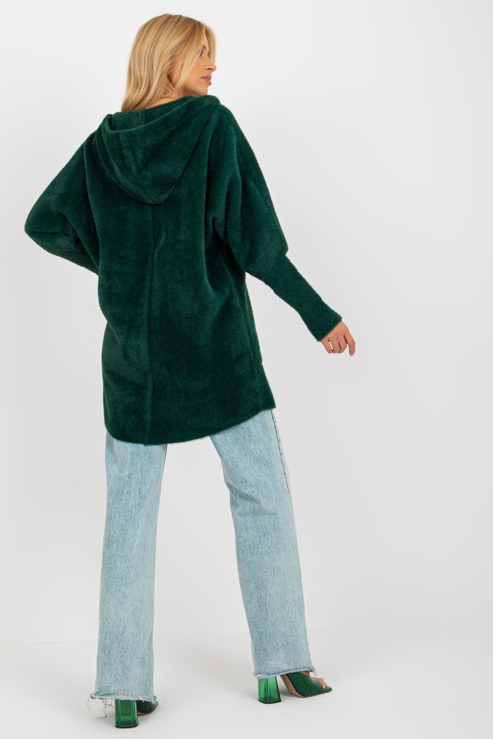 Tamsiai žalios spalvos alpakų paltas su gobtuvu ir užtrauktuku.