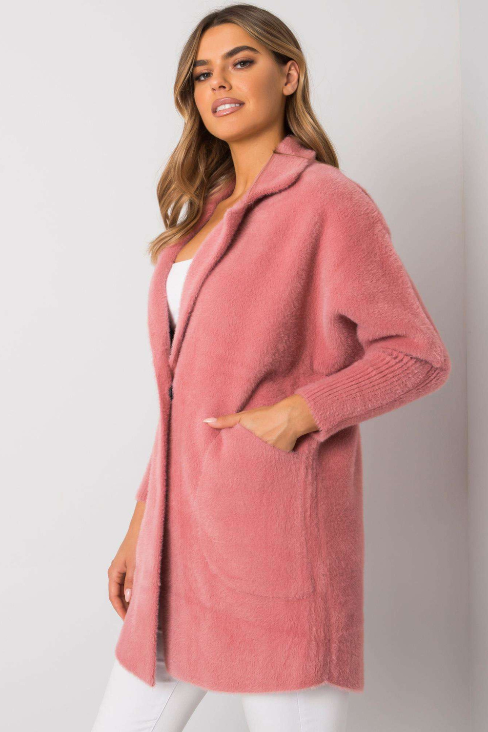 Rožinis alpakos pūkuotas paltas .