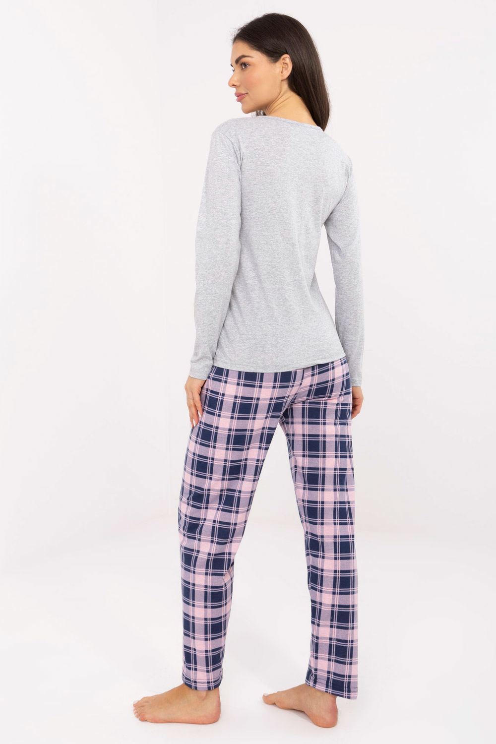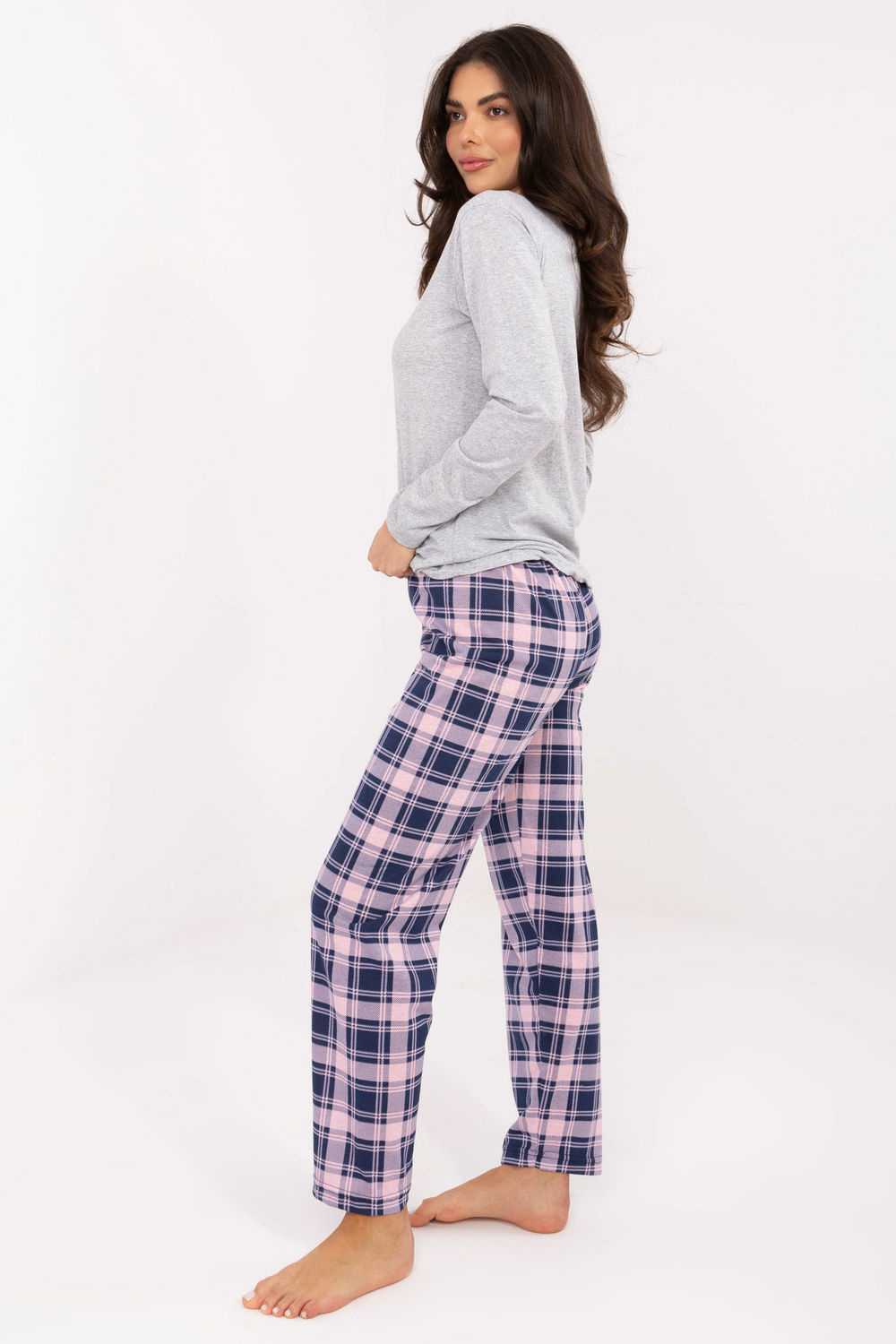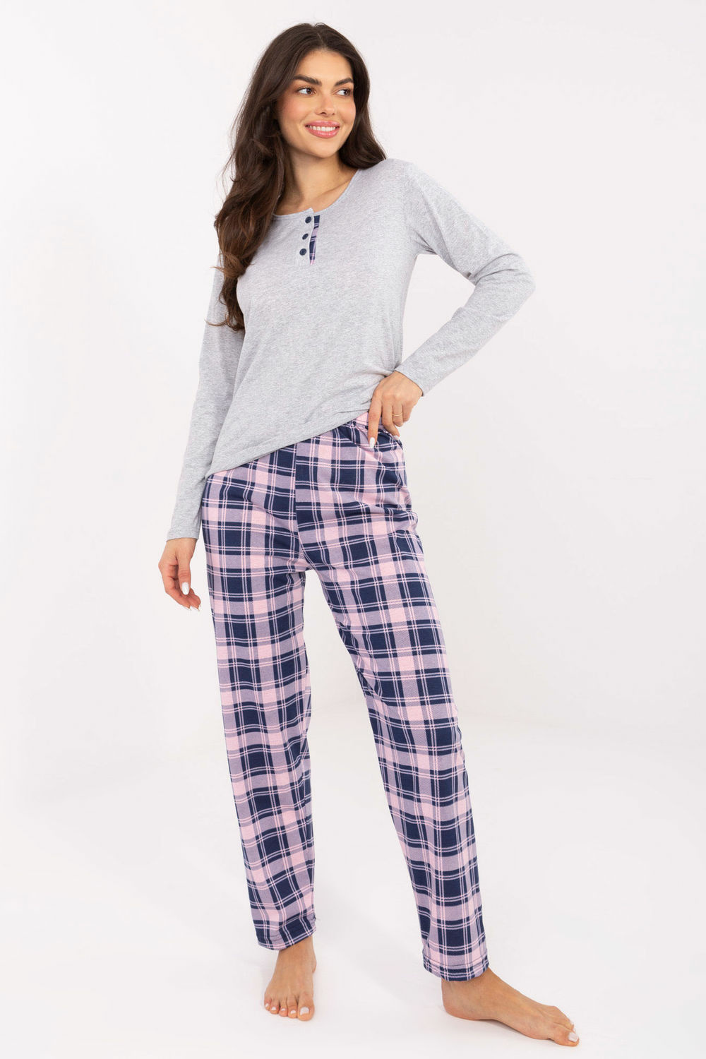 Women's pajamas are a comfortable, two-piece set consisting of a palaidinė and pants. The palaidinė has a round neckline, long sleeves, and three buttons on the front, which add a subtle, decorative accent. The pants with long, straight legs stand out with a dominant check pattern, giving the whole a classic and elegant character. The loose fit provides full freedom of movement and comfort during sleep and relaxation at home. This is an ideal proposition for women who value comfort, functional cut, and stylish, timeless design.