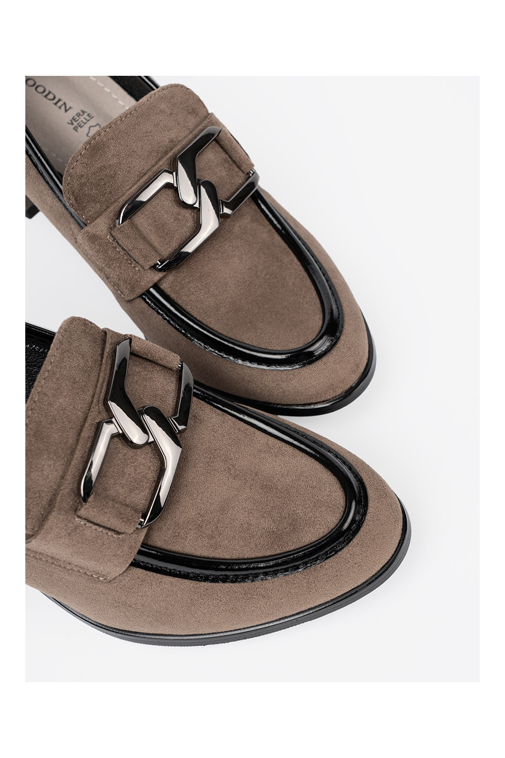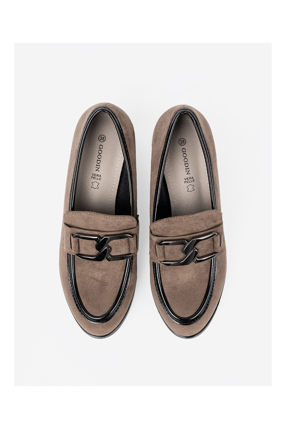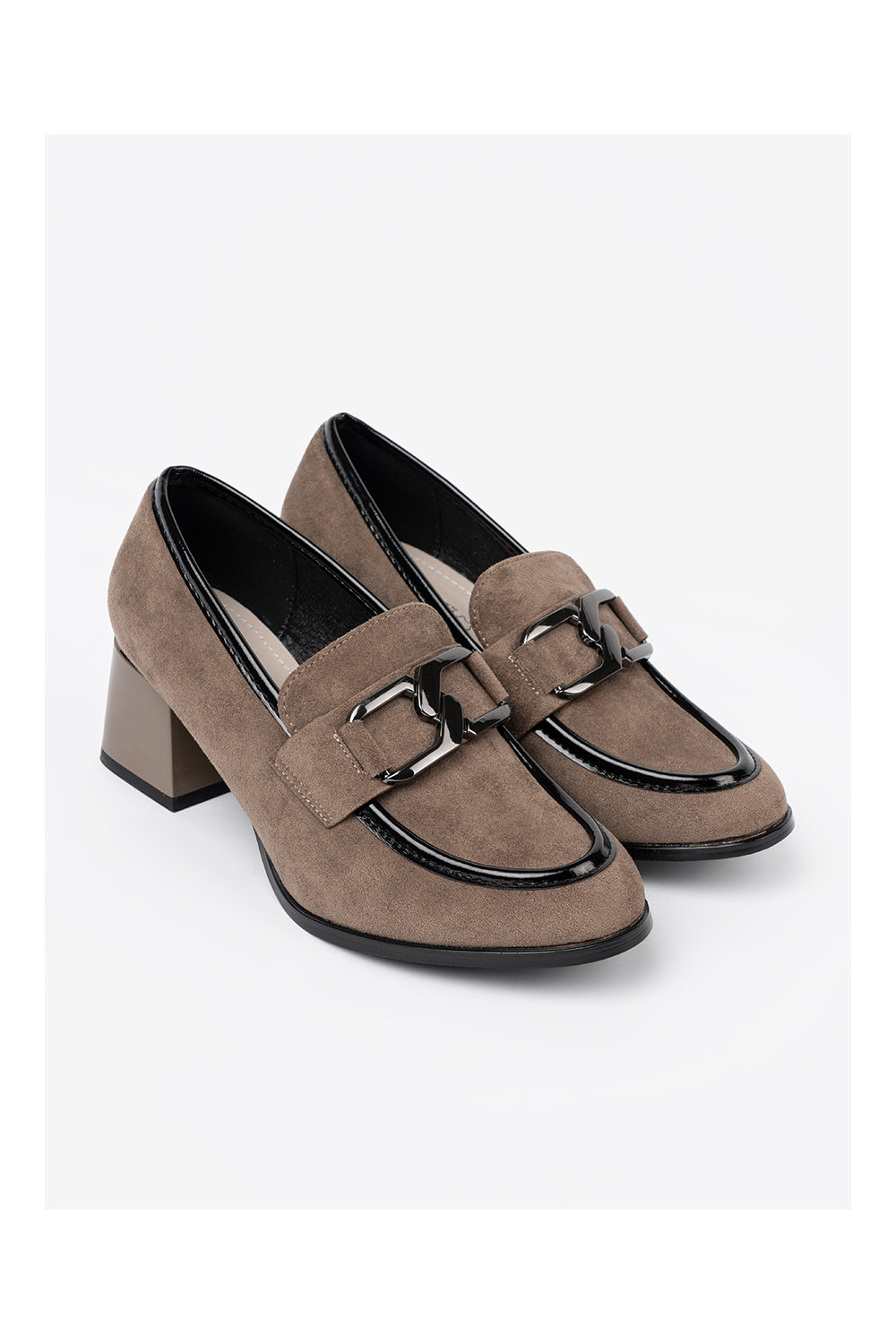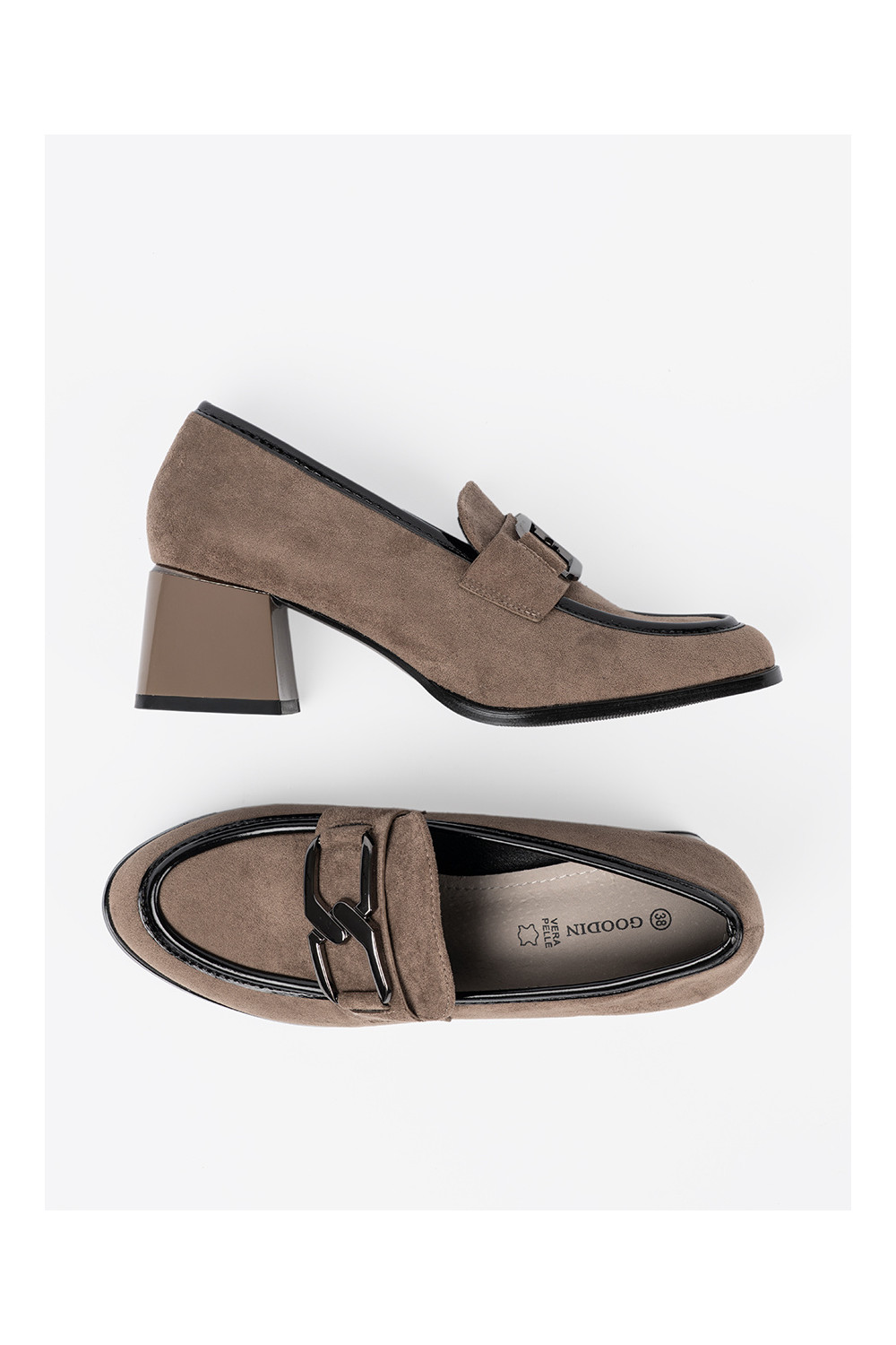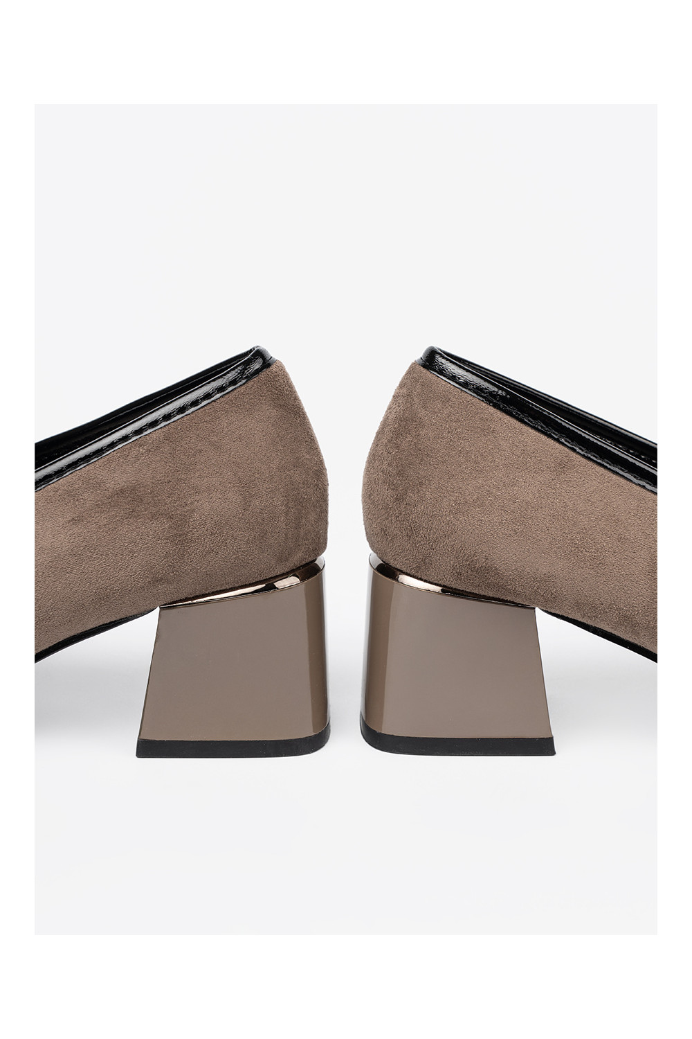 smėlio spalvos zomšiniai pusbačiai ant storo kulno