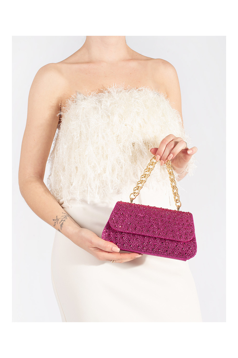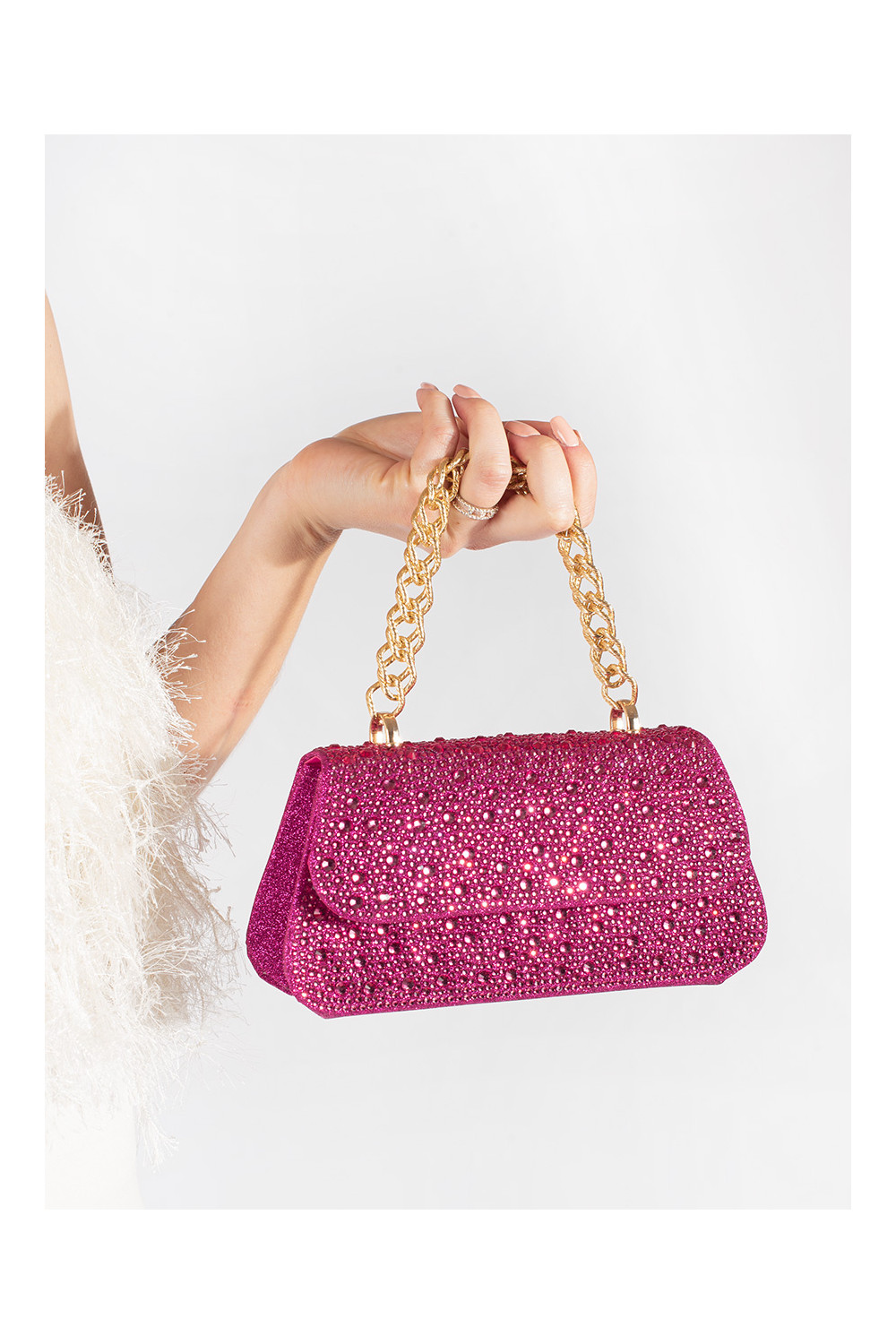 Violetinės spalvos maža rankinė su kristalų dekoracija