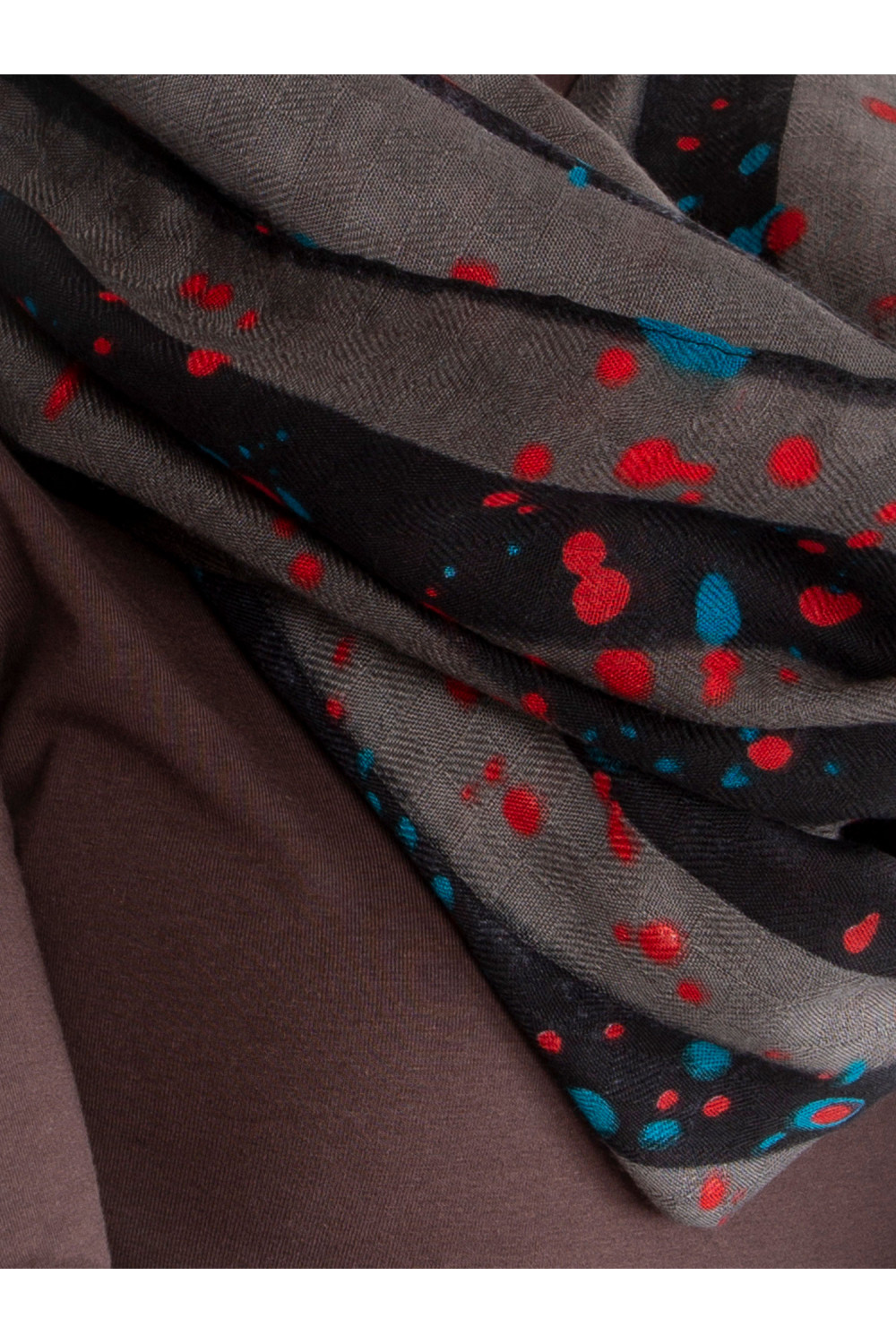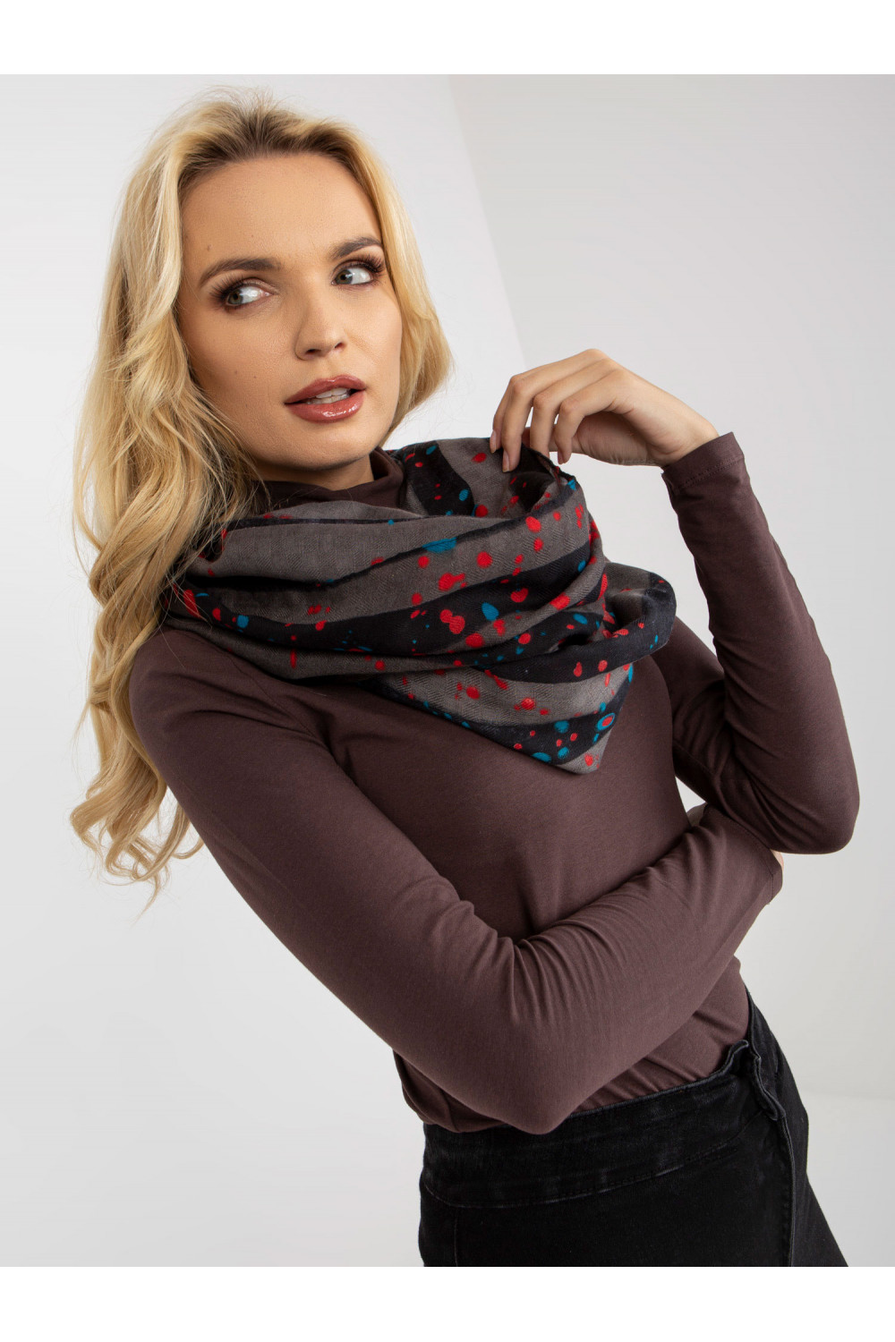 Grauer Damen-Schlingenkamin mit Aufdrucken. Produkto kodas: AT-KM-6178.20 Dominantes Muster: Druck Maße: ca. 94 x 186 cm