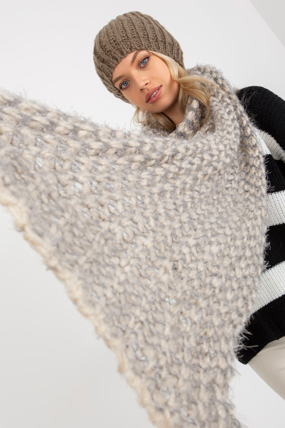 Smėlio ir pilkos spalvos moteriškas megztas šalikas .
