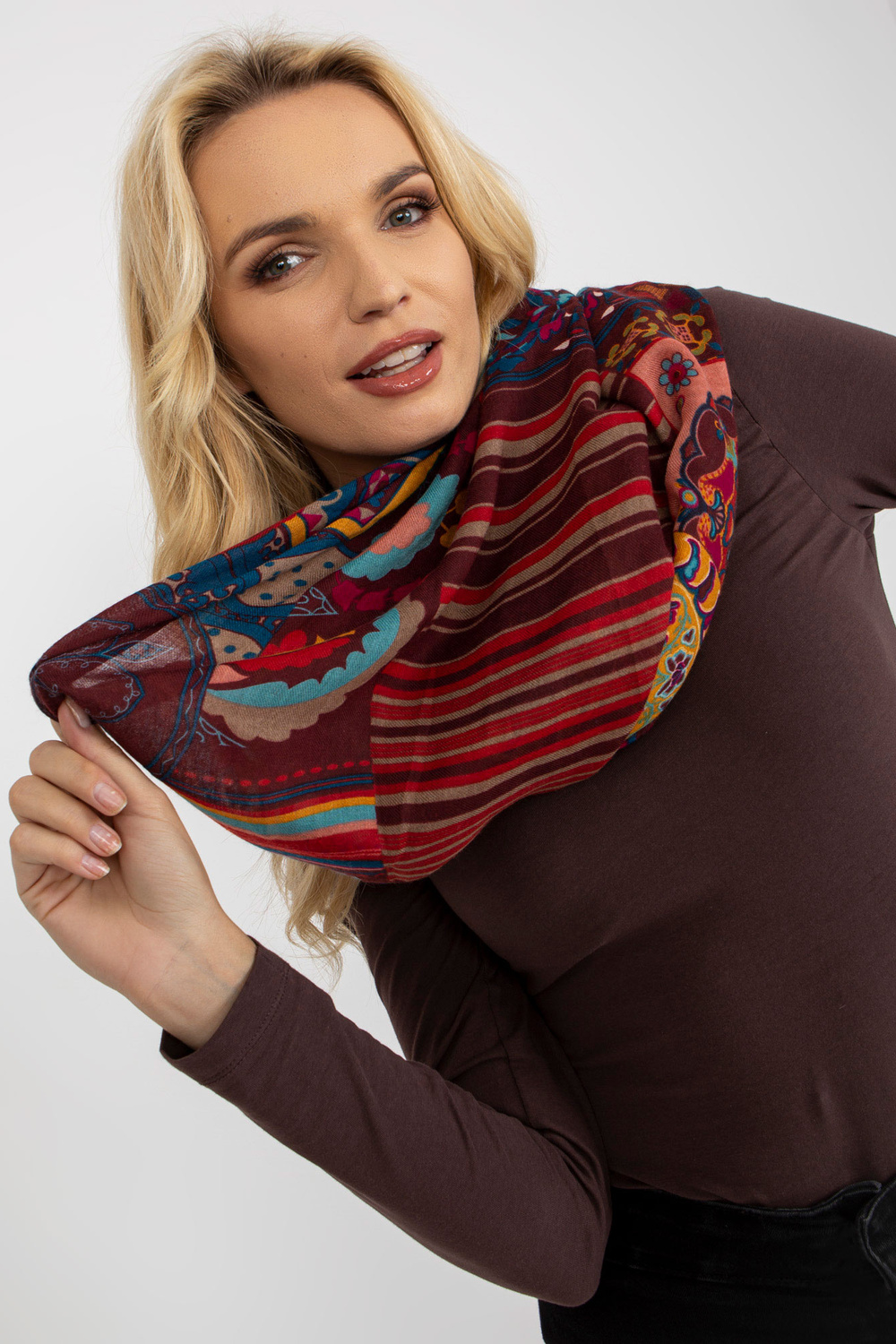 Burgunderfarbener Damen-Schlingenkamin su Aufdruck Produkto kodas: AT-KM-ENEC-A9.91 Dominantas Turinys: Druck Masė: ca. 176 x 92 cm