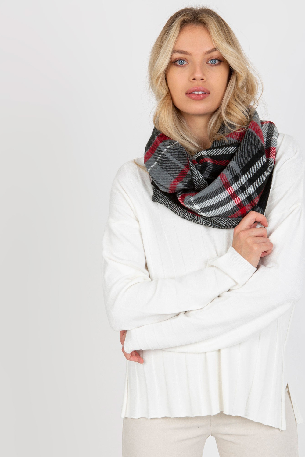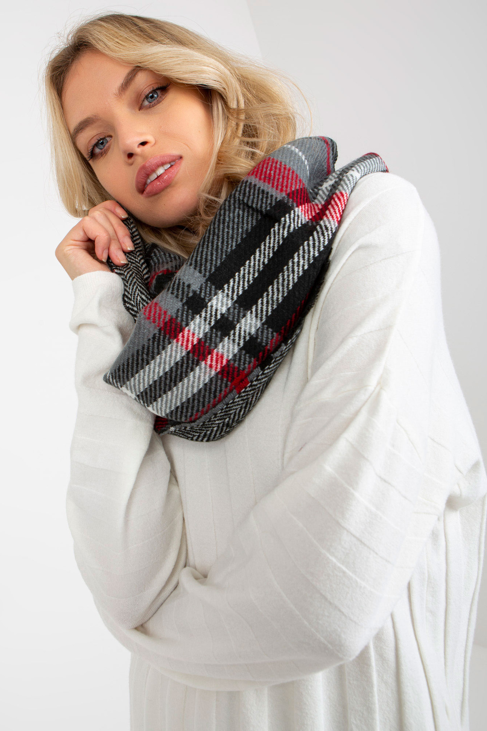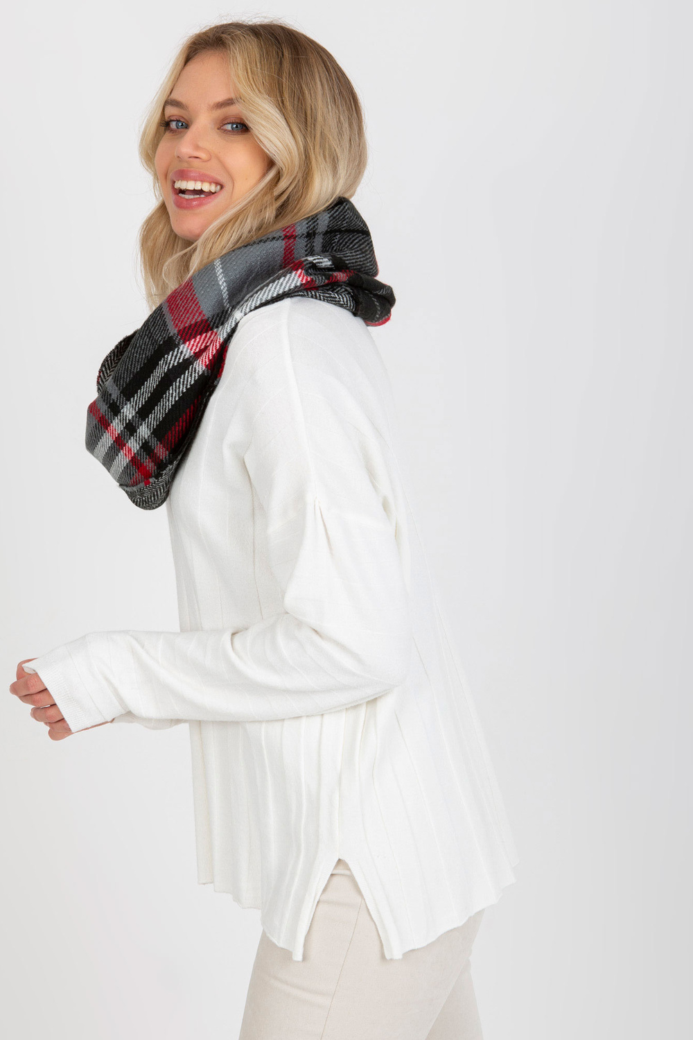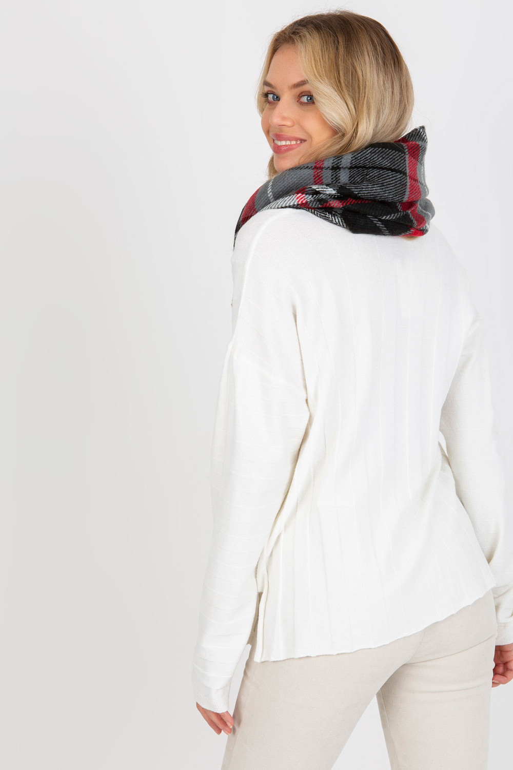 Pilkai raudonas šiltas kaminas su languotu raštu. Prekės kodas: AT-KM-1402.20 dominuojantis raštas: grotelės Matmenys: ilgis - 85 cm, plotis - 53 cm