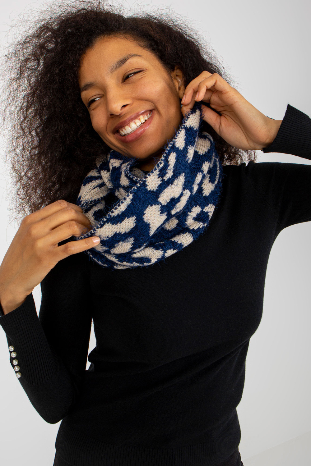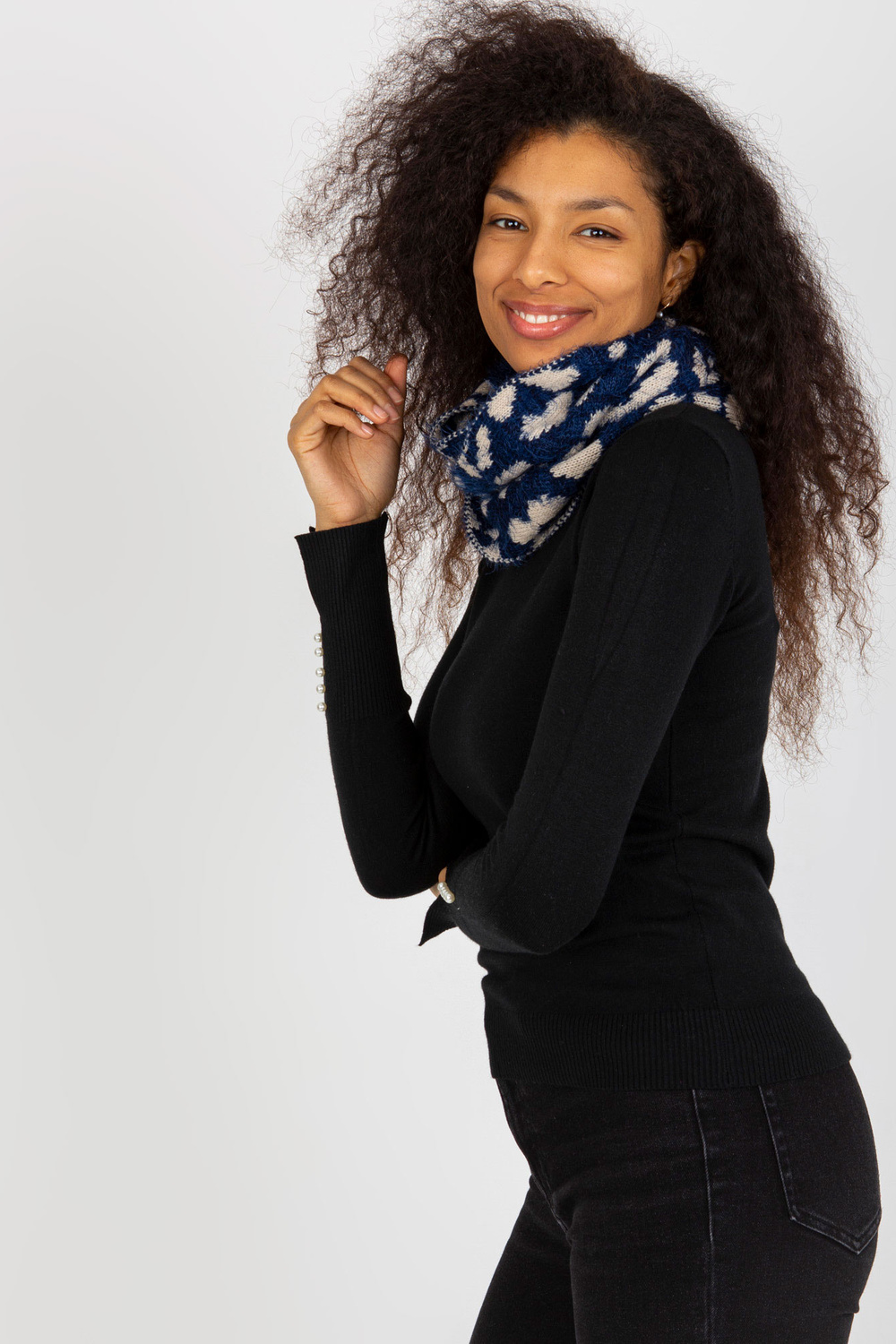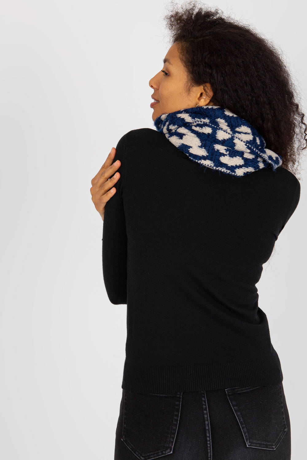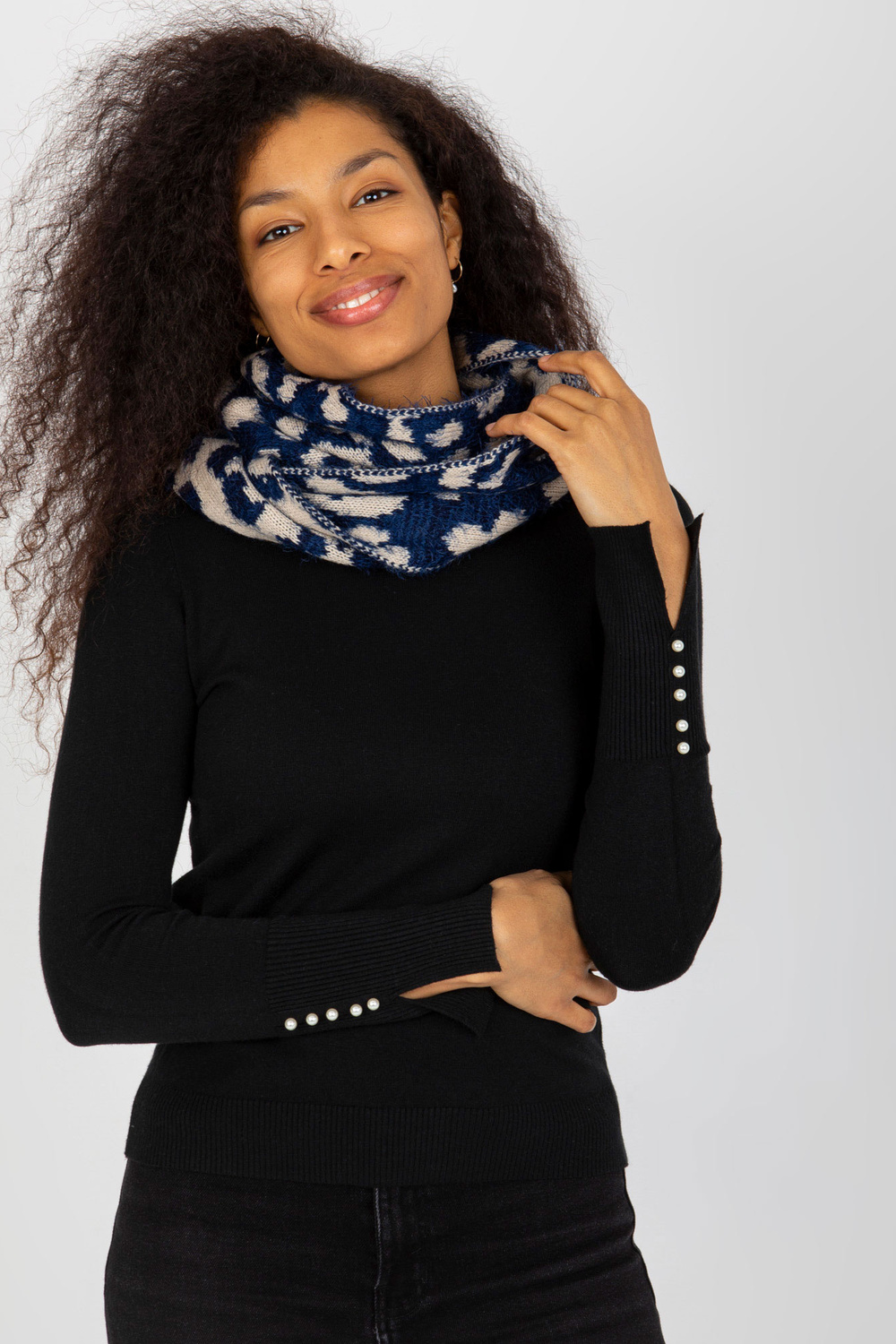 Tamsiai mėlynos ir šviesiai smėlio spalvos moteriškas kaminas su raštais.