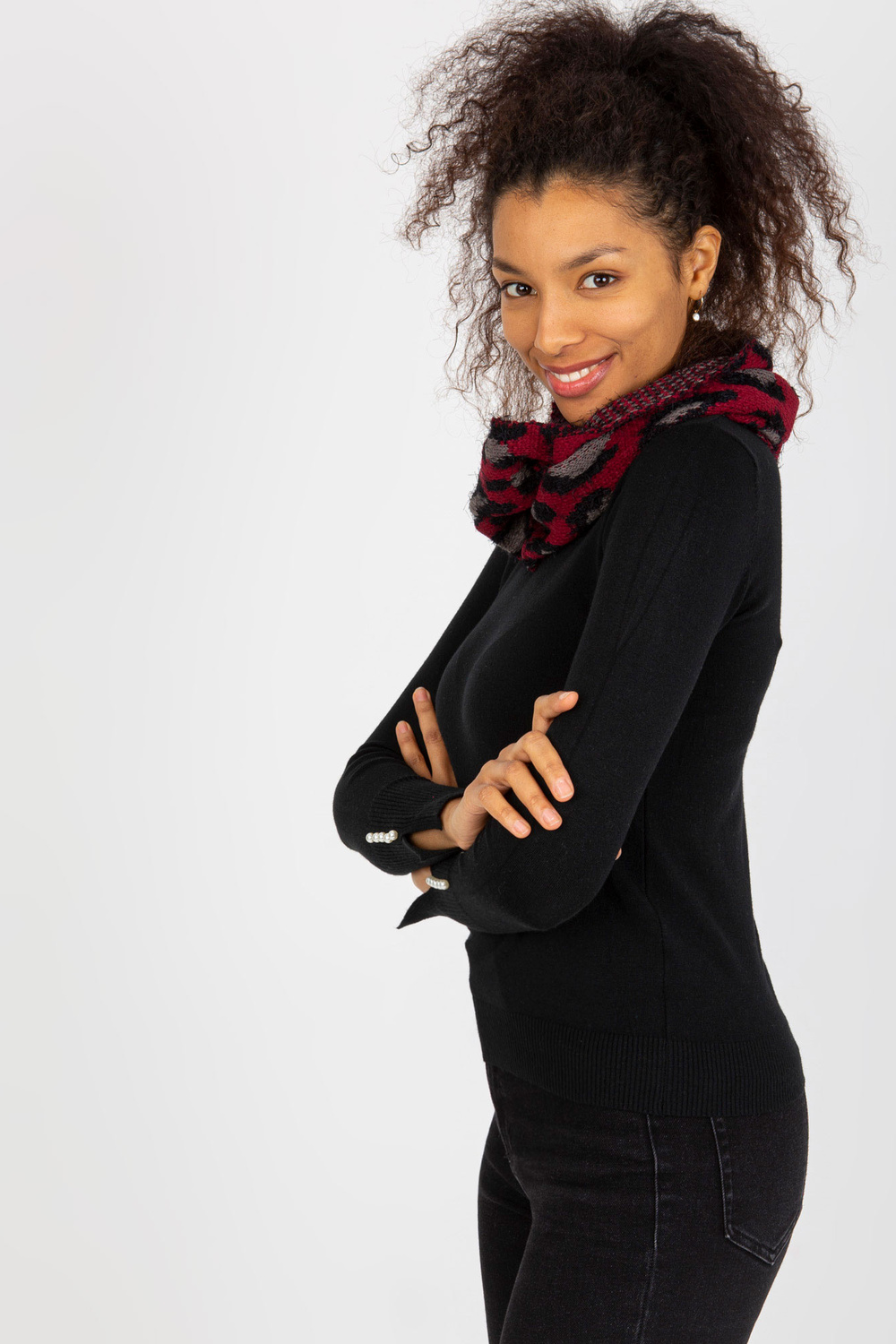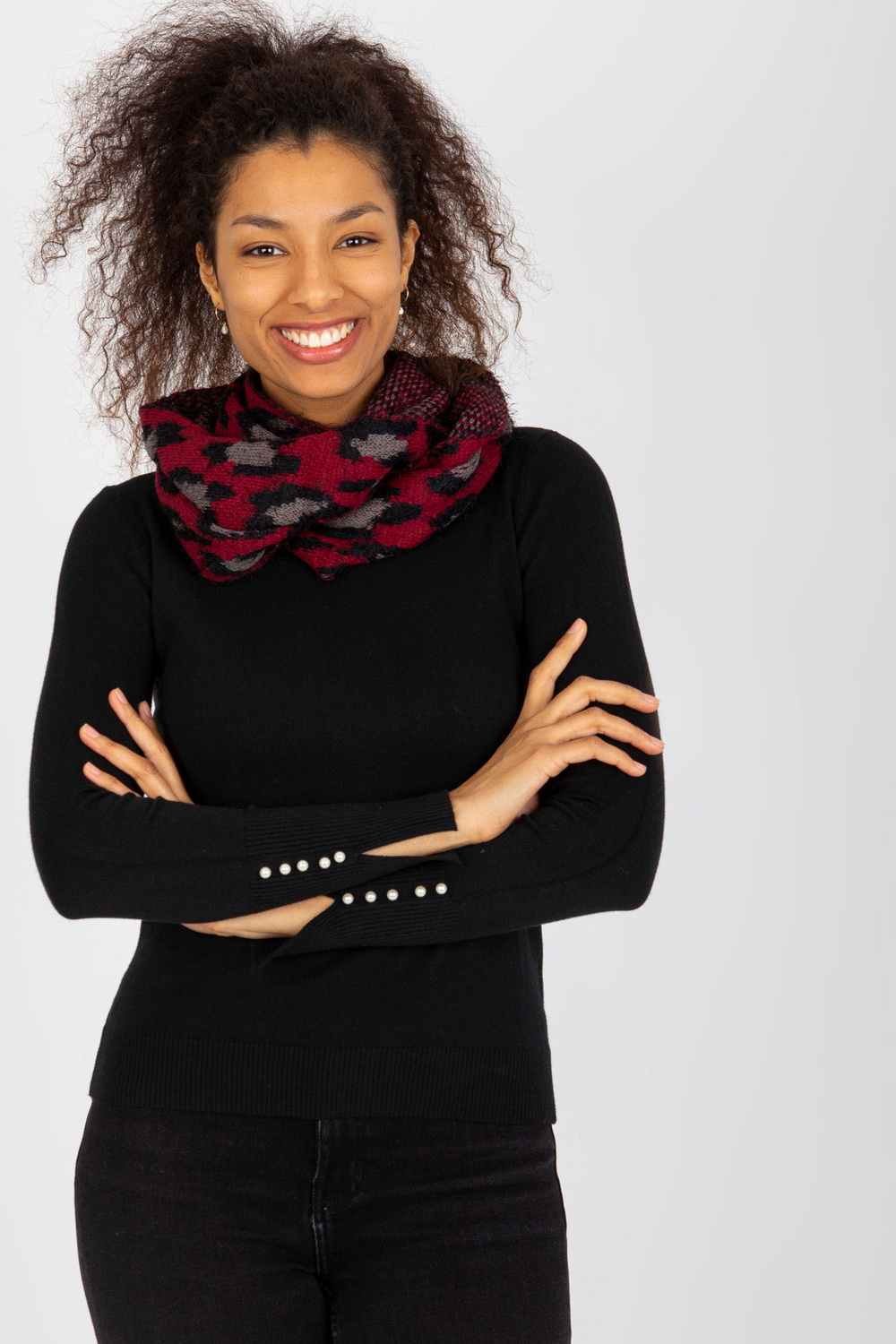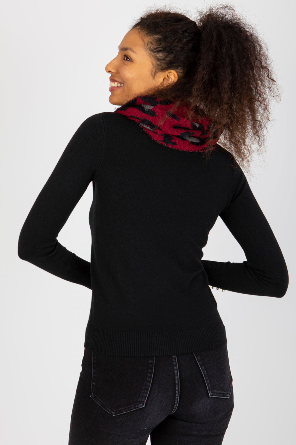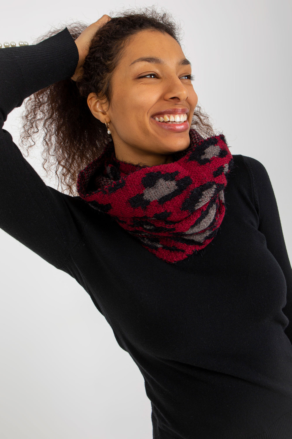 Raudonas ir juodas moteriškas žieminis kaminas gyvūnų raštais.