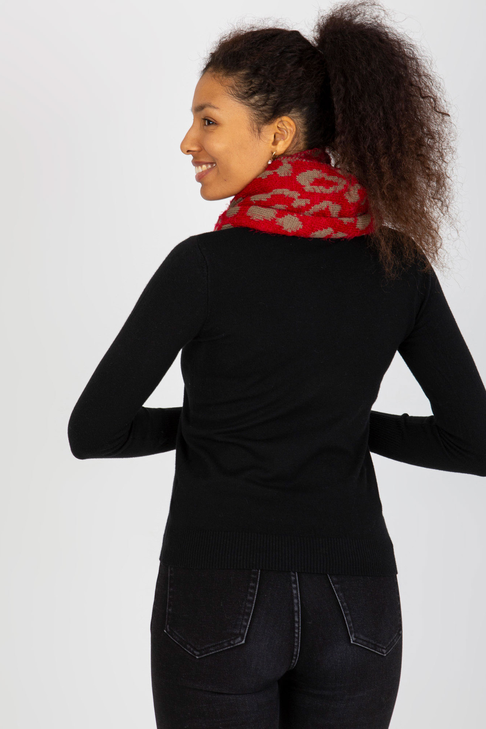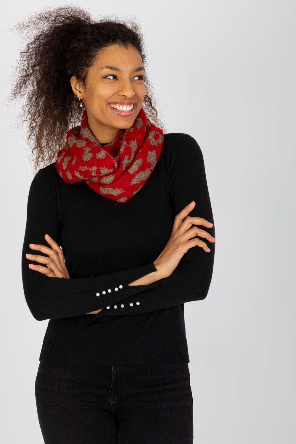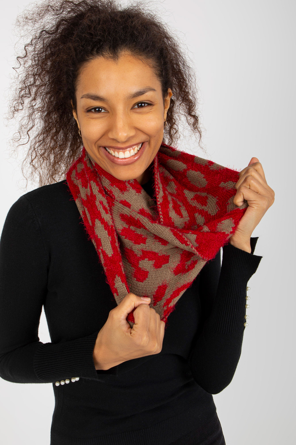Raudona ir tamsiai smėlio spalvos moteriškas kaminas su raštais.
