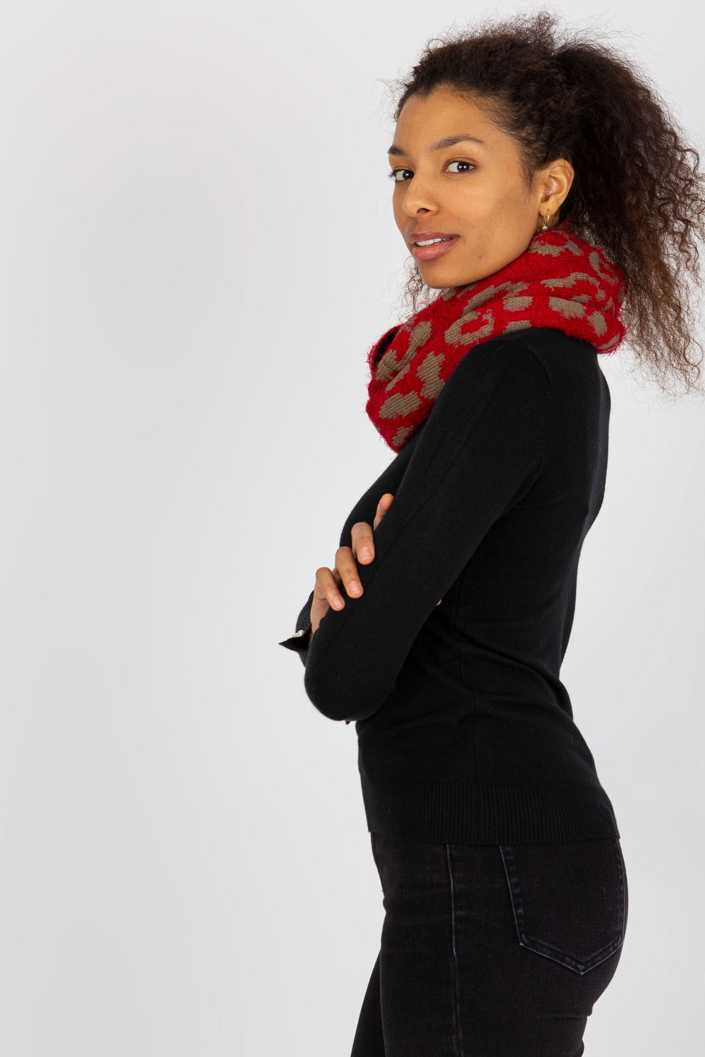 Raudonos ir tamsiai smėlio spalvos moteriškas raštuotas kaminas