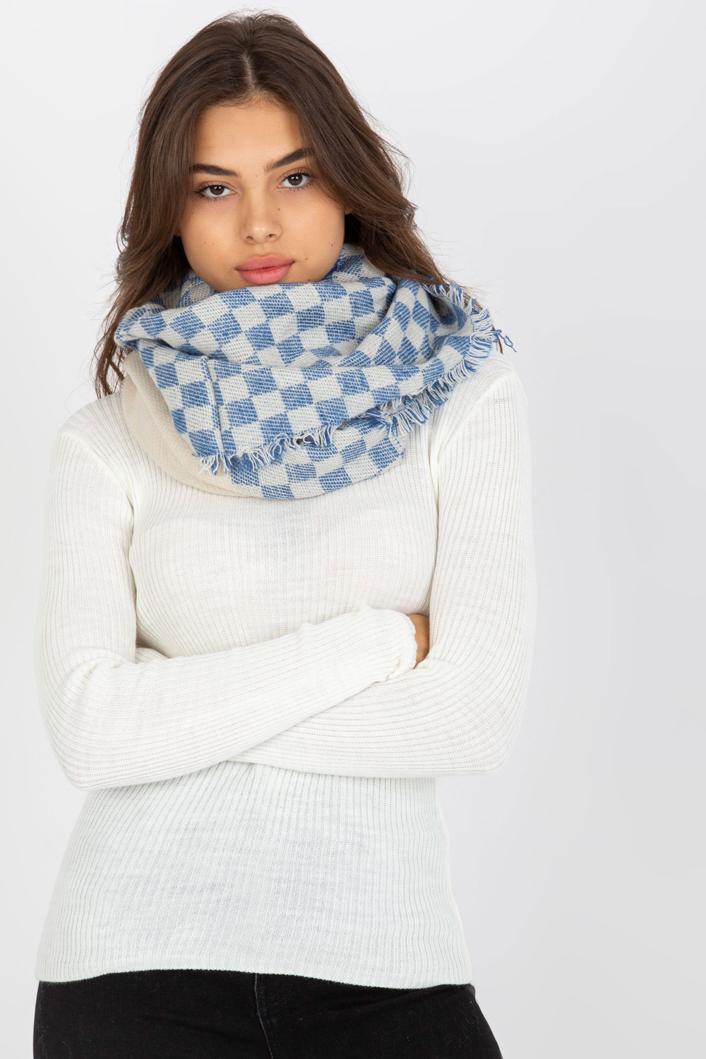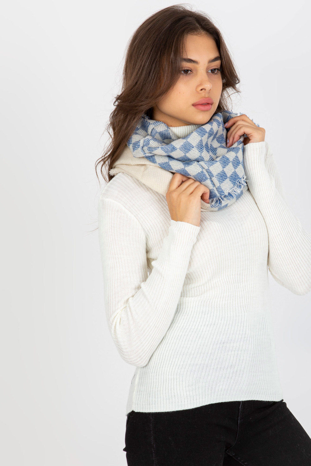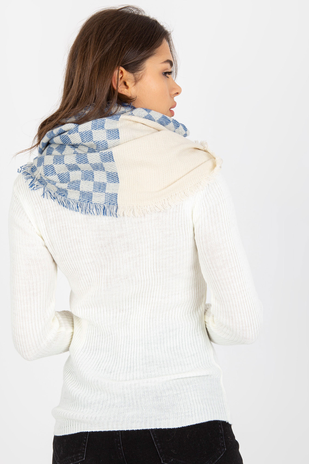 Ecru-tamsiai mėlynos spalvos languotas moteriškas kaminas.