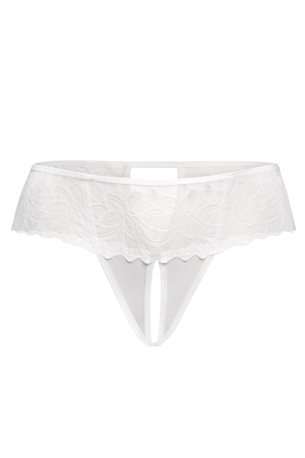 We present to you our exclusive women's thongs, which are both seductive and extremely comfortable. Intended for confident women who want to feel sexy and feminine. These extraordinary white thongs will provide you with unforgettable experiences. Their designer look and careful craftsmanship will surely attract attention. The wide lace wraps around the hips, with a subtle floral motif adding to their unique charm. The innovative solution lies in the lower part, around the crotch area. They are made of delicate mesh that subtly shines through, emphasizing your feminine sensuality. Additionally, the product has an open crotch, which is an incredibly spicy and seductive detail. An interesting accent is the teardrop-shaped cutout at the back. This gives an impressive look while ensuring comfort. Our thongs are the perfect choice for confident women who want to feel sexy and seductive. Unique details, high quality craftsmanship, and the subtlety of the materials make this product the perfect combination of classic and modern.