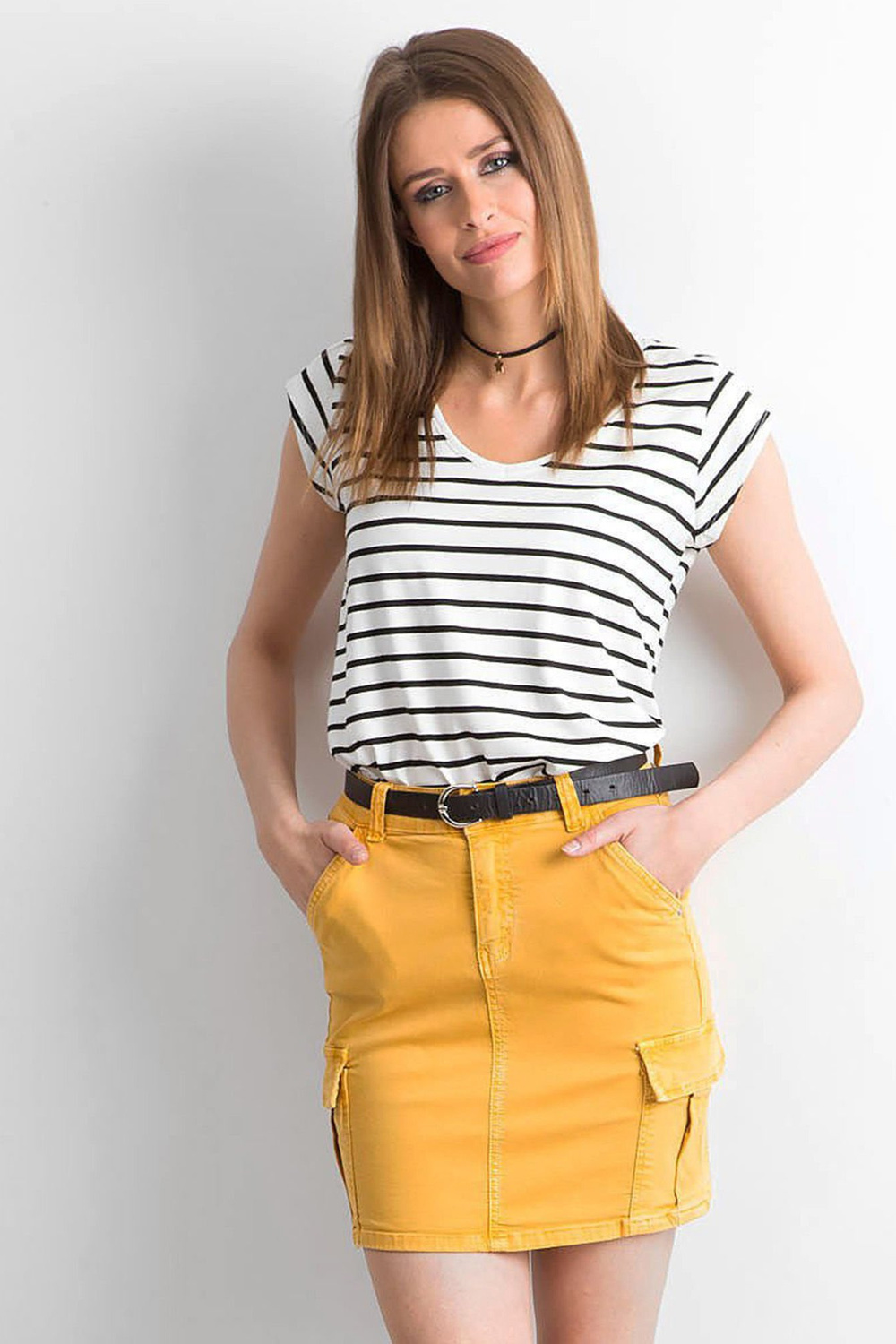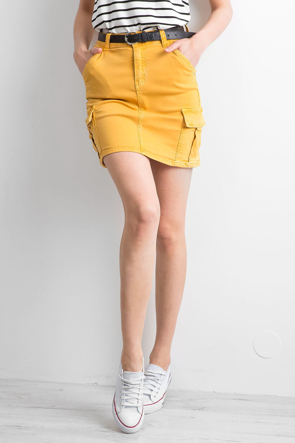 Geltonas džinsinis sijonas su kišenėmis .