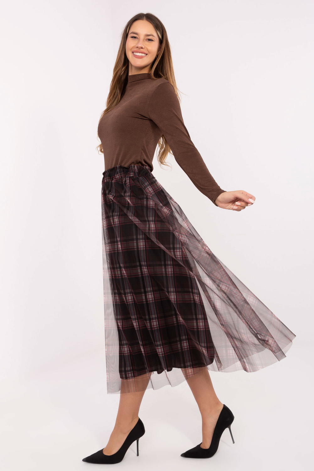 Modelis dėvi vieno dydžio drabužį. Modelio matmenys: ūgis 176 cm, krūtinės apimtis 90 cm, liemens apimtis 62 cm, klubų apimtis 94 cm.
