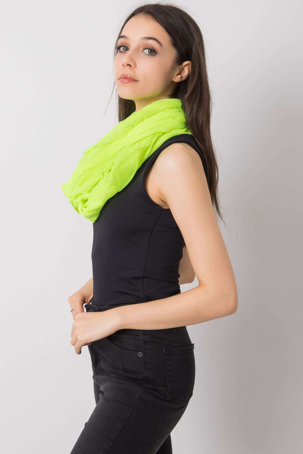 Fluogeltonas kaminas su blizgiomis aplikacijomis. medžiagos sudėtis: 100% viskozė skalbimo būdas: skalbimas mašinoje 30°C matmenys: apytiksl. 73 x 166 cm