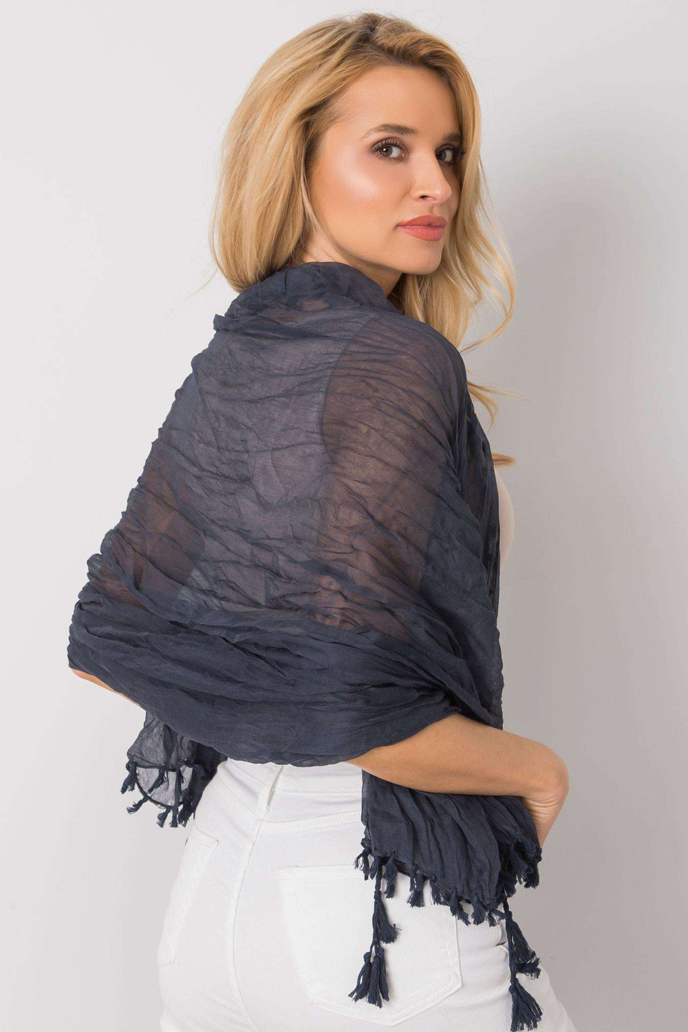 Mėlynos spalvos šalikas su kutais.