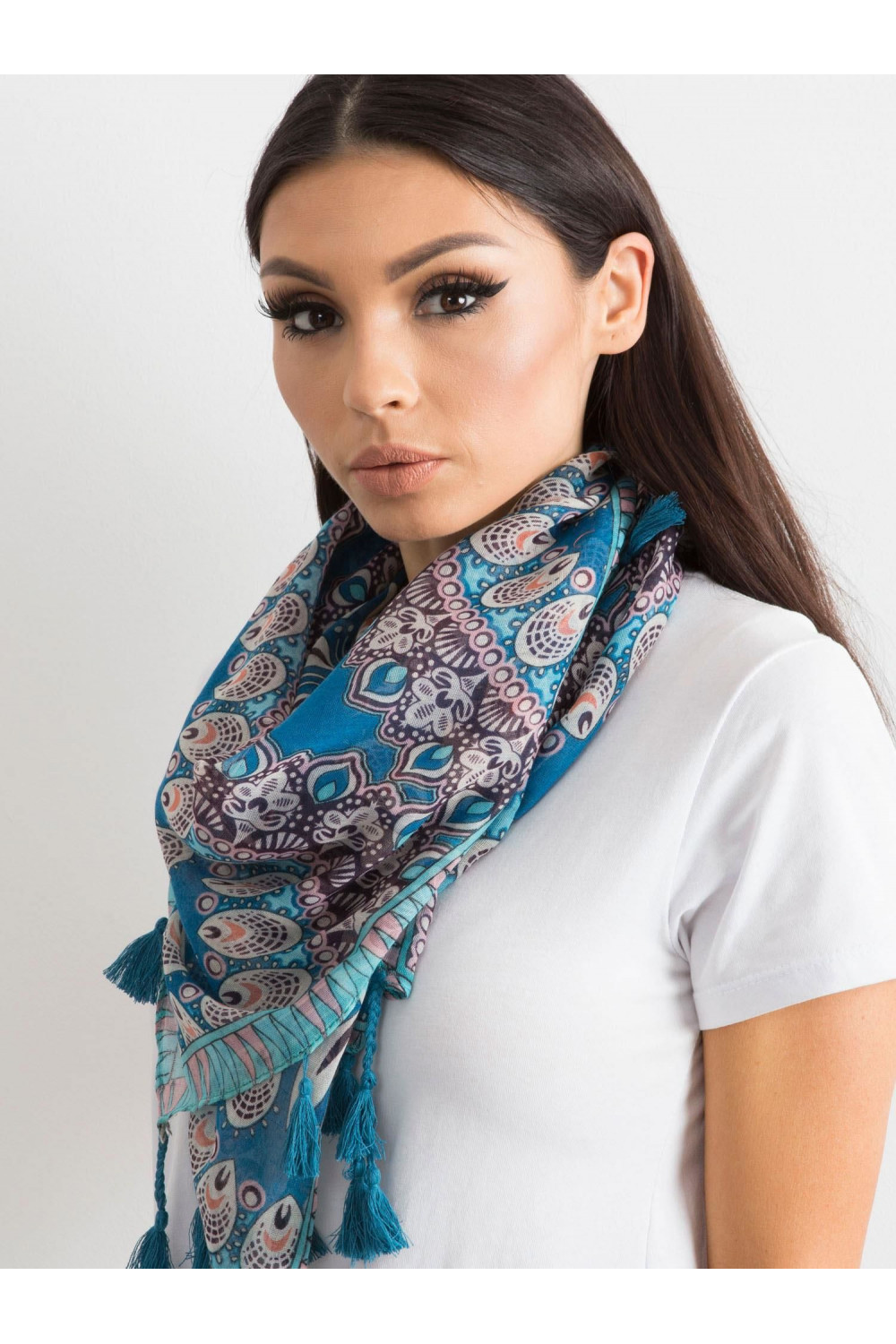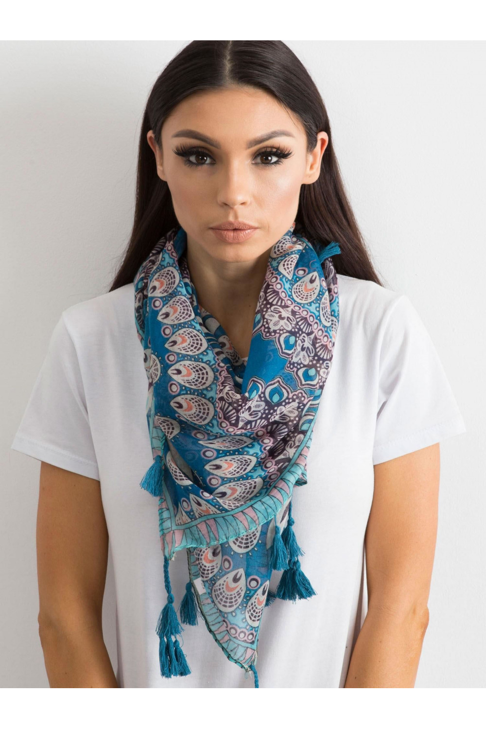 Mėlynas šalikas su etniniu raštu .